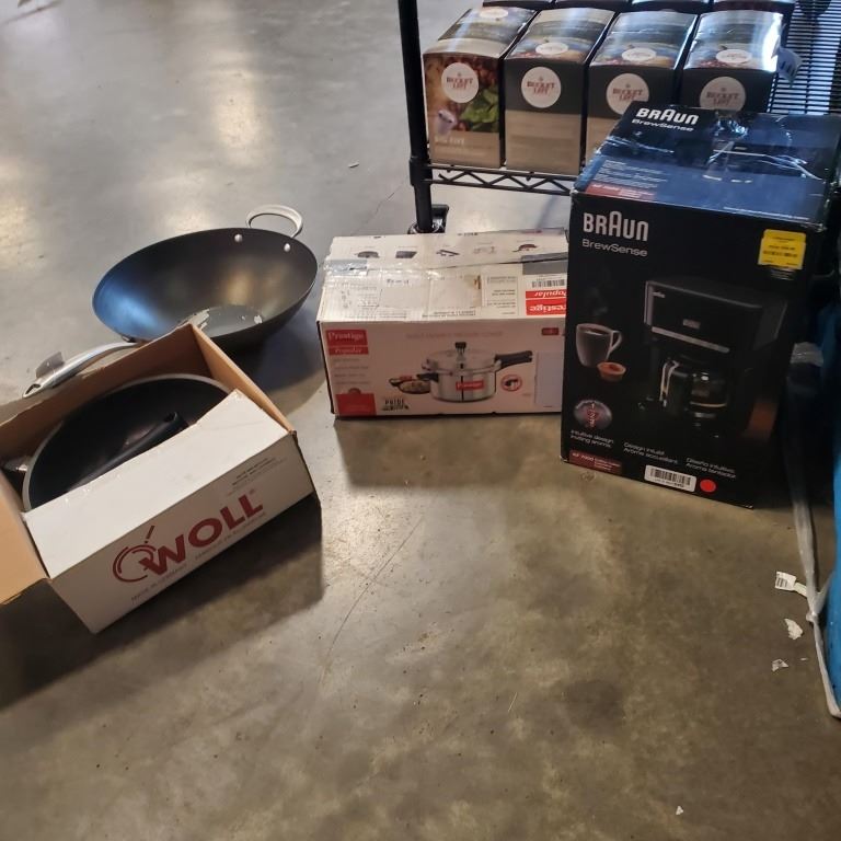 BRAUN BREW SERVE COFFEE MAKER WITH PRESTIGE PRESSURE COOKER, WOK AND WOLL FRY PAN