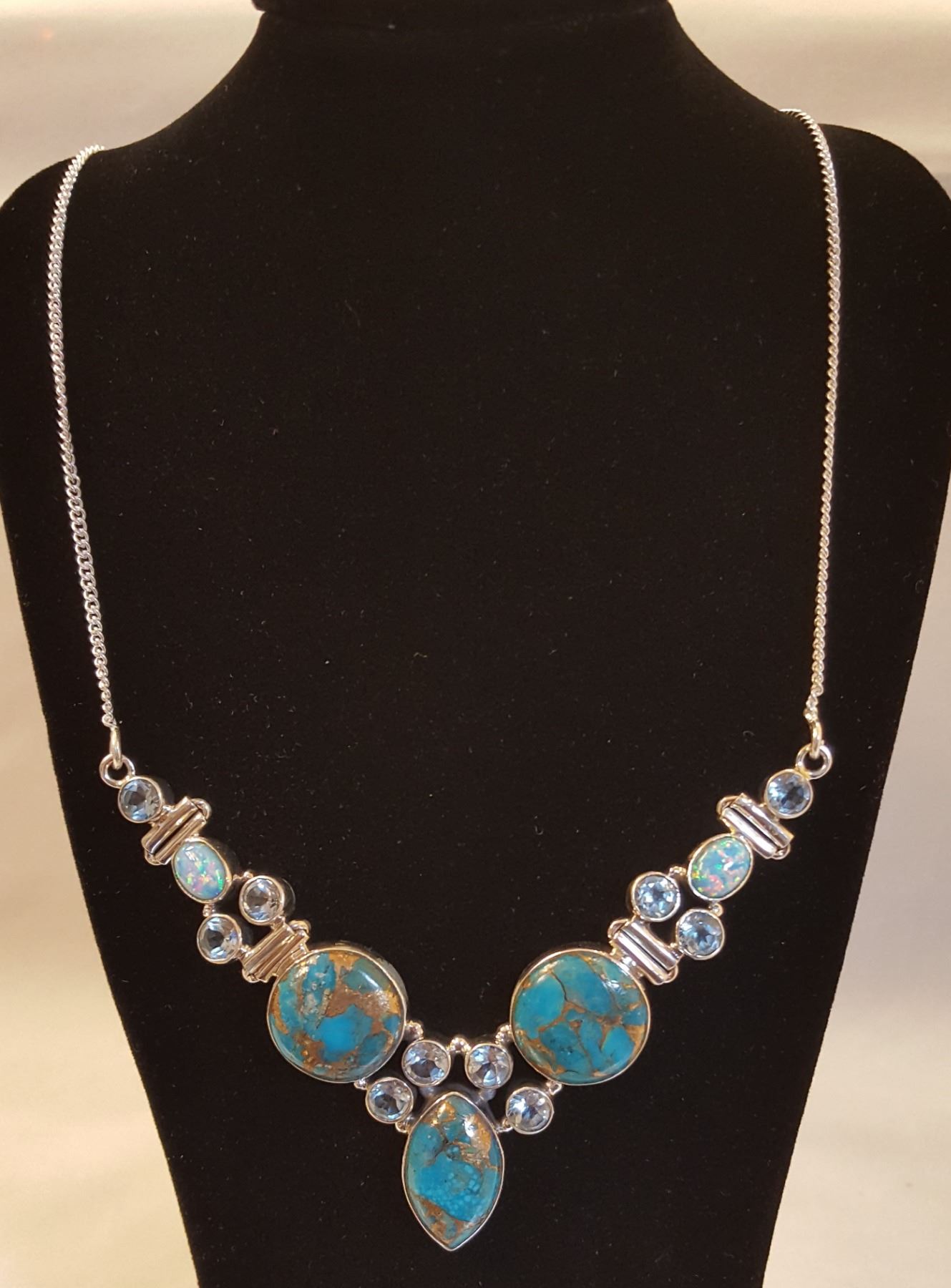 BREATHTAKING NATURAL ARIZONA BLUE TURQUOISE AND COPPER ACCENT NECKLACE. INCLUDES 8 SKY BLUE TOPAZ HIGHLIGHT STONES. MOUNTED IN SOLID .925 STERLING SILVER. 19" LONG STERLING SILVER CHAIN. 22 GRAM TOTAL WEIGHT. TURN SOME HEADS WITH THIS NECKLACE LADIES.