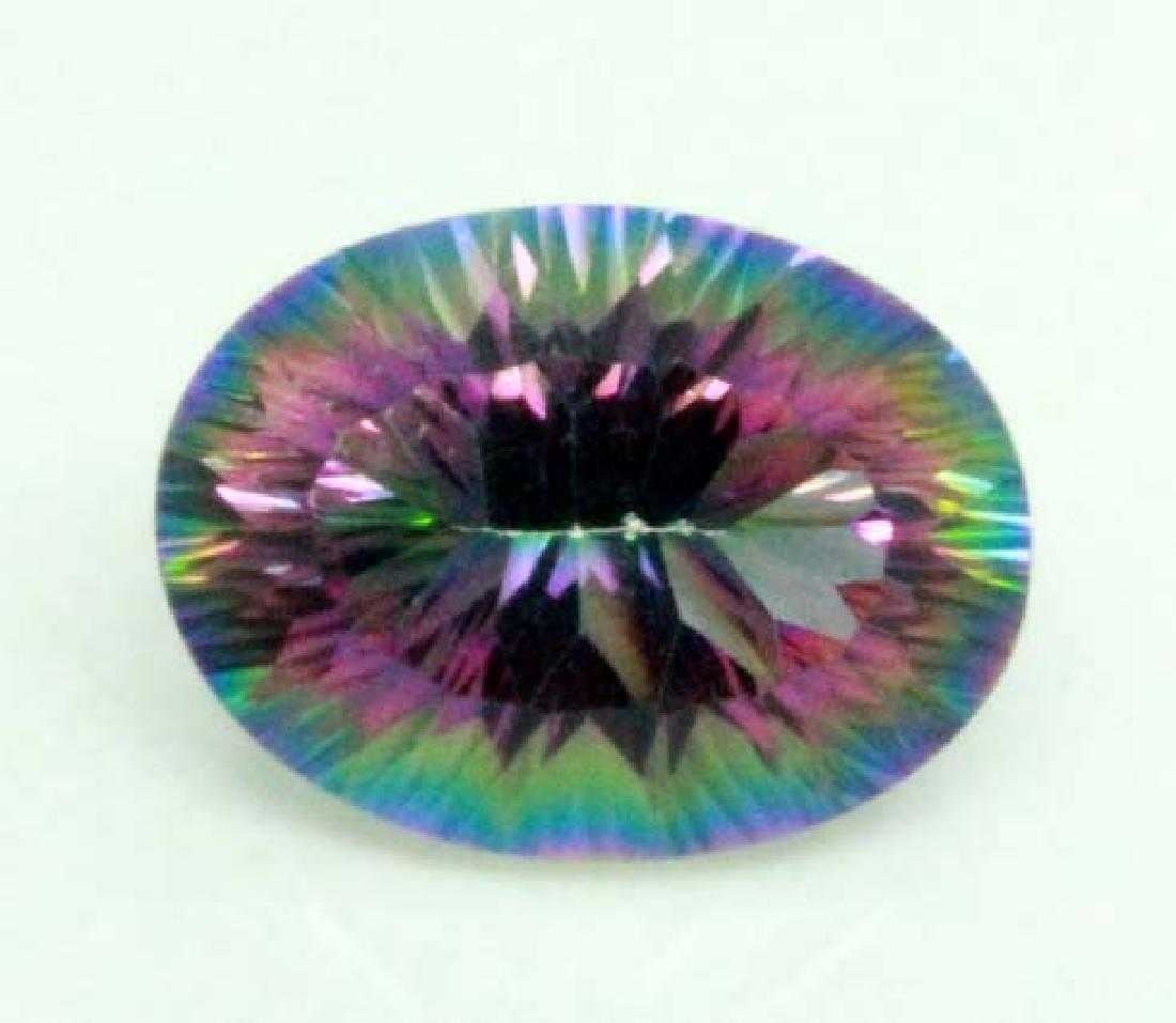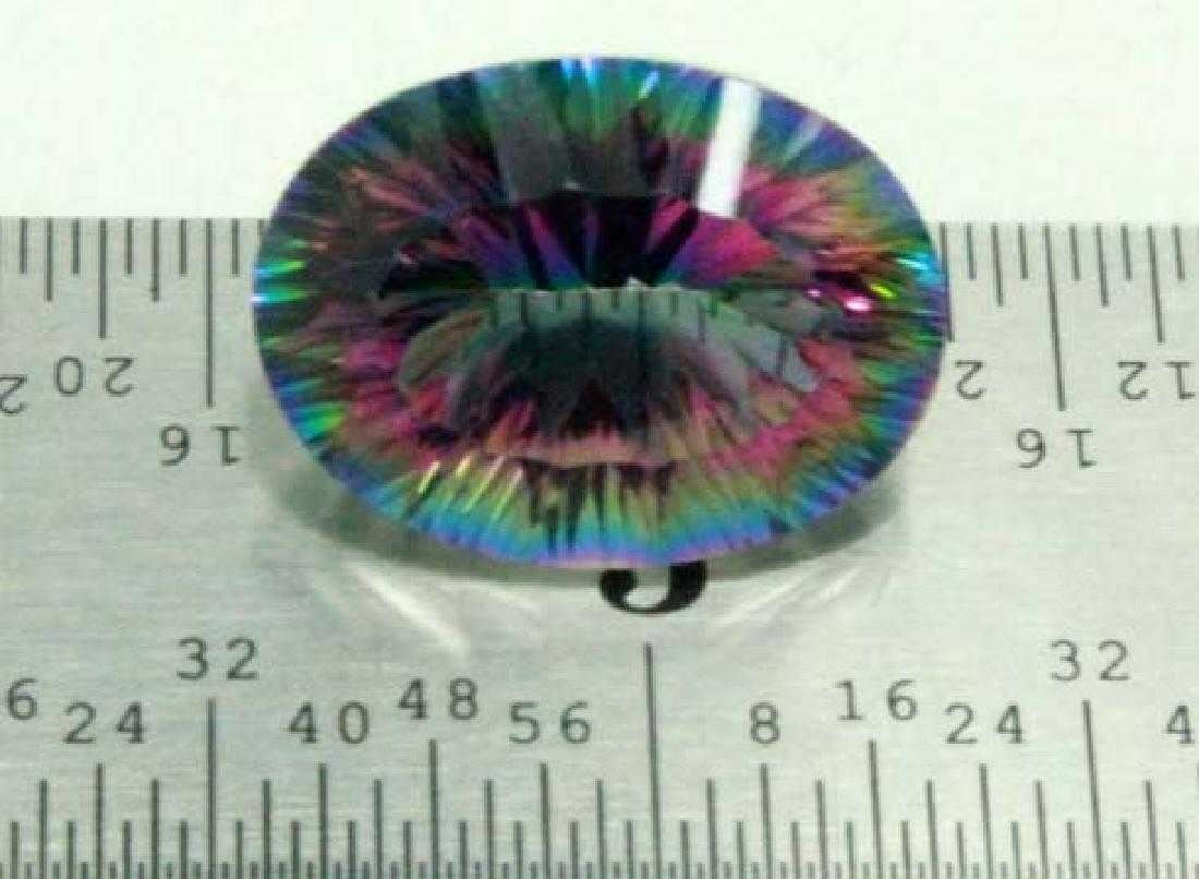 BRILLIANT CERTIFIED 16.18 CT MYSTIC TOPAZ. THIS INVESTMENT GRADE MYSTIC TOPAZ EXHIBITS STRONG SATURATION MULTIPLE FLASHING COLORS . FANCY CONCAVE OVAL CUT