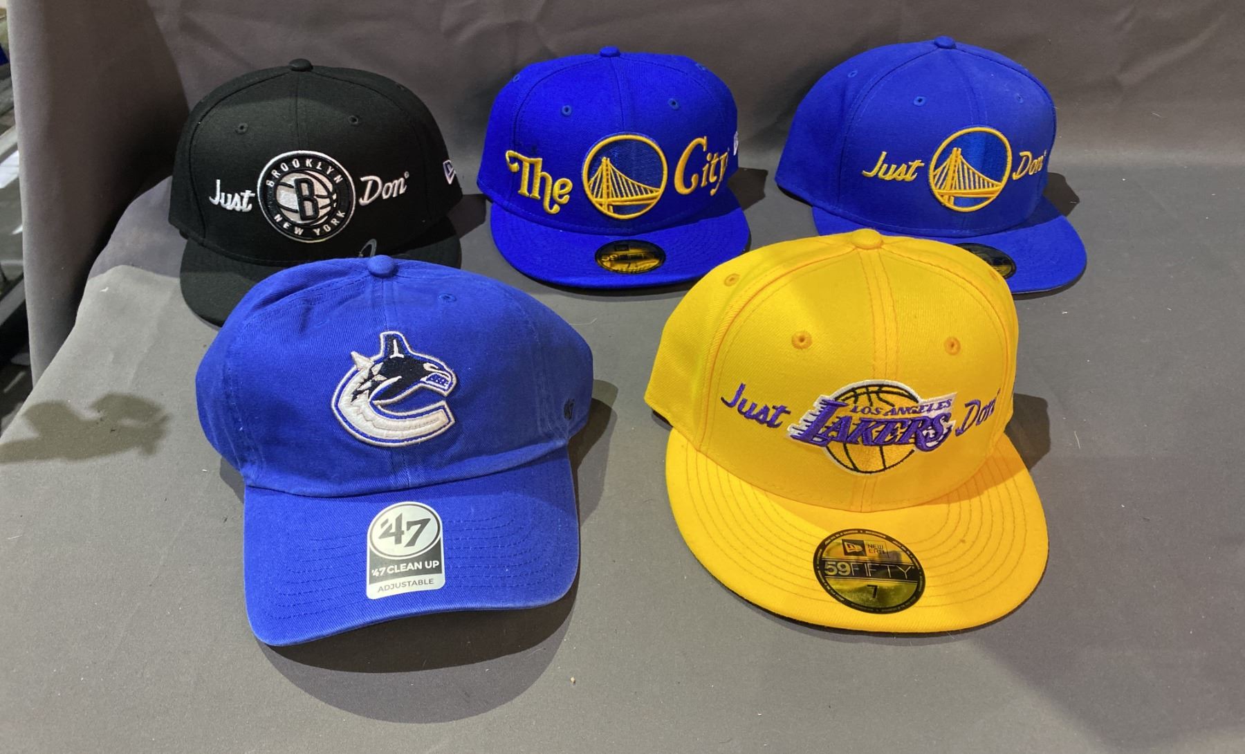 BROOKLYN NETS JUST DON HAT RETAIL $99, THE CITY HAT RETAIL $50, CANUCKS HAT RETAIL $35, GOLDEN STATE JUST DON HAT RETAIL $99 & LAKERS JUST DON HAT RETAIL $99