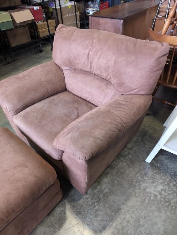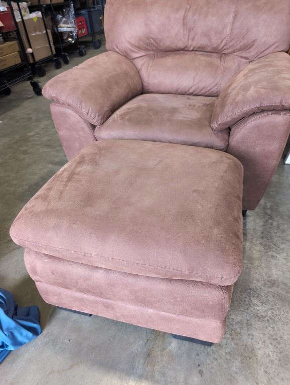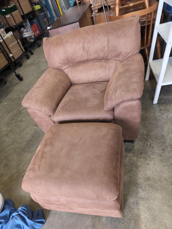 BROWN FABRIC LIVING ROOM CHAIR AND MATCHING OTTOMAN, VERY CLEAN GOOD CONDITION