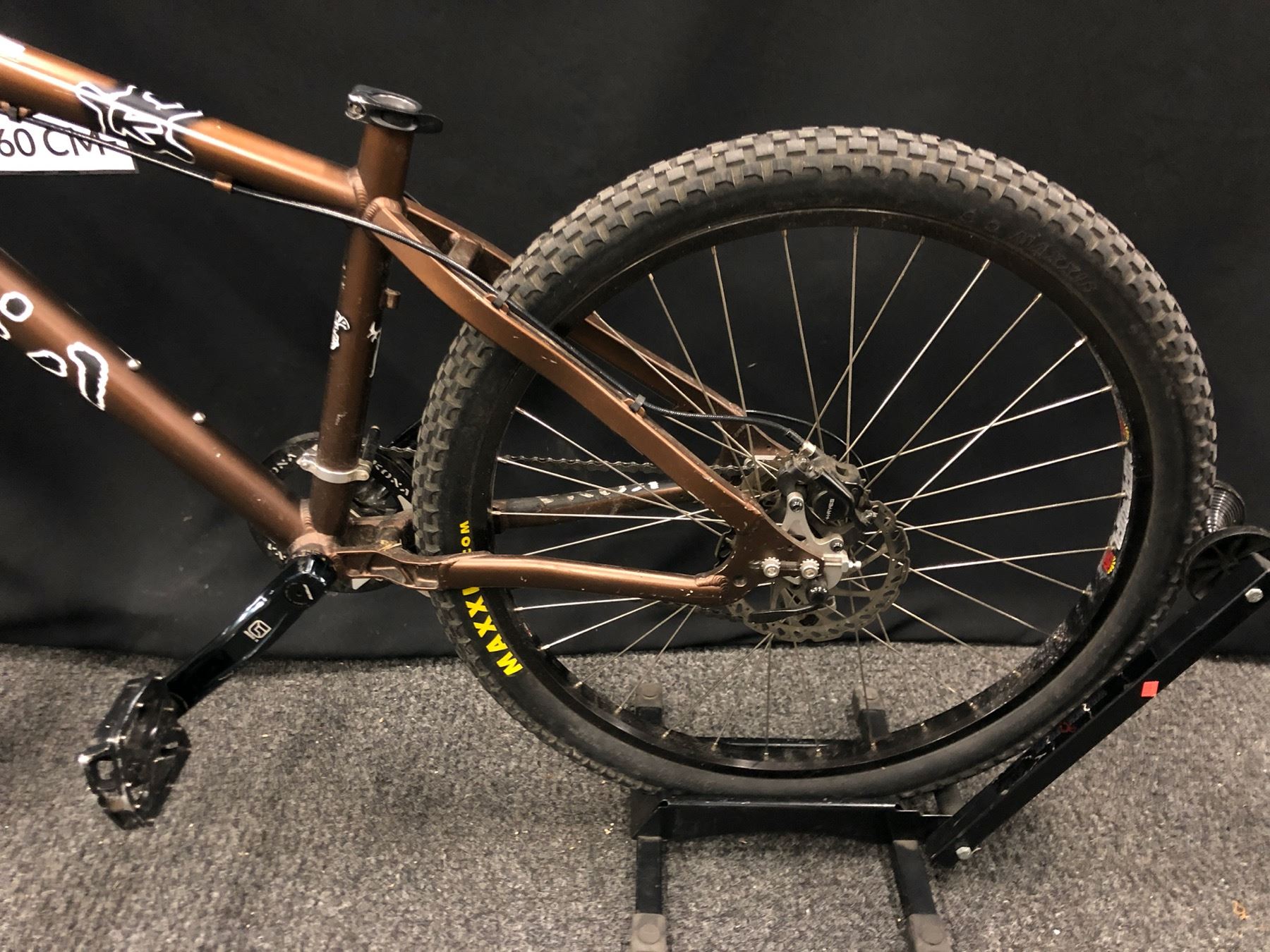 BROWN KONA COWAN 9 SPEED FRONT SUSPENSION DIRT JUMPING BIKE WITH FRONT AND REAR HYDRAULIC DISC BRAKES, NO SEAT