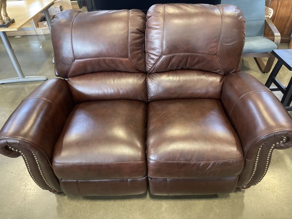 BROWN LEATHER DOUBLE RECLINING LOVESEAT WITH BRASS NAILHEAD
