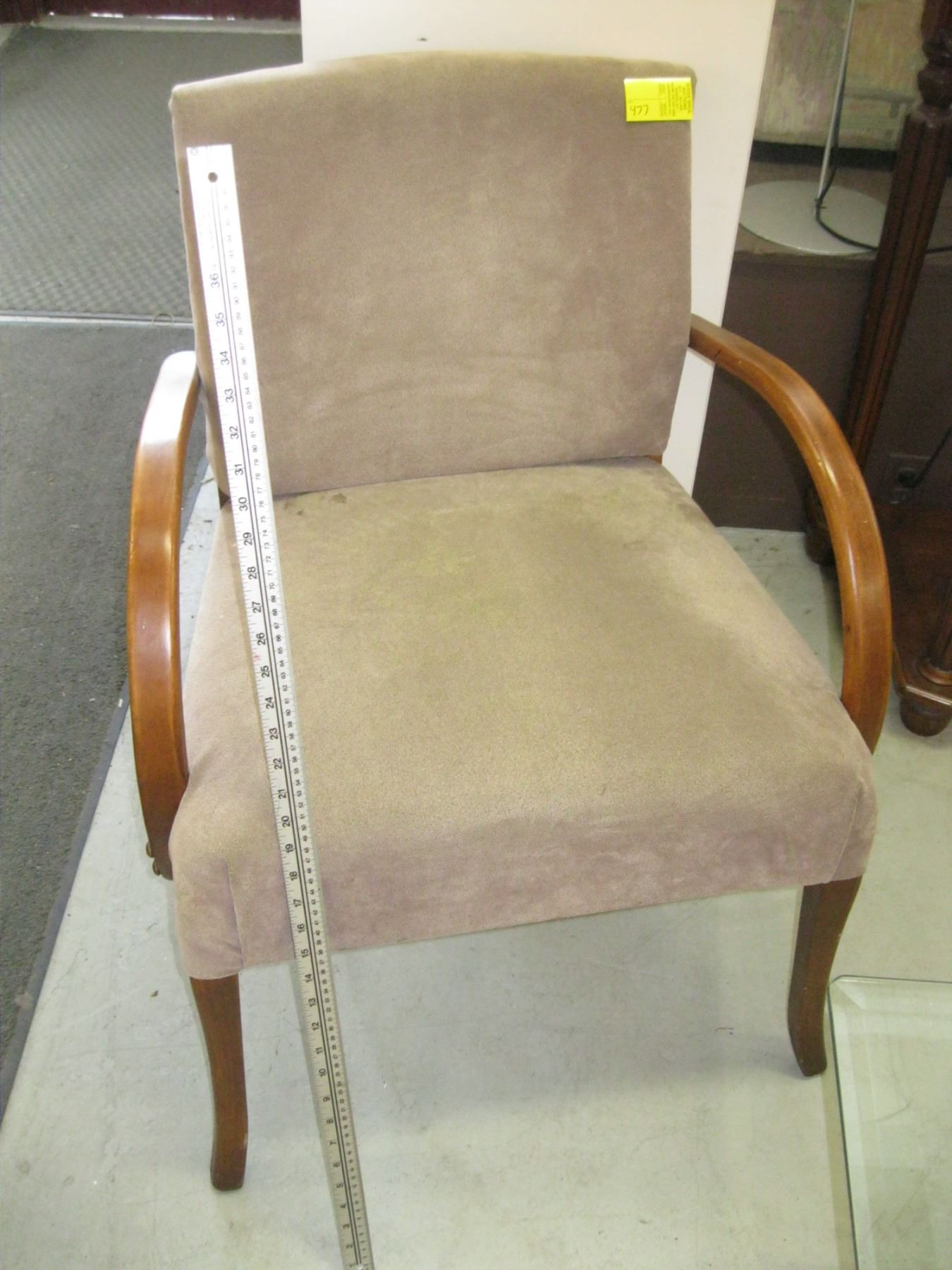 BROWN UPHOLSTERED CHAIR WITH WOODEN ARMS