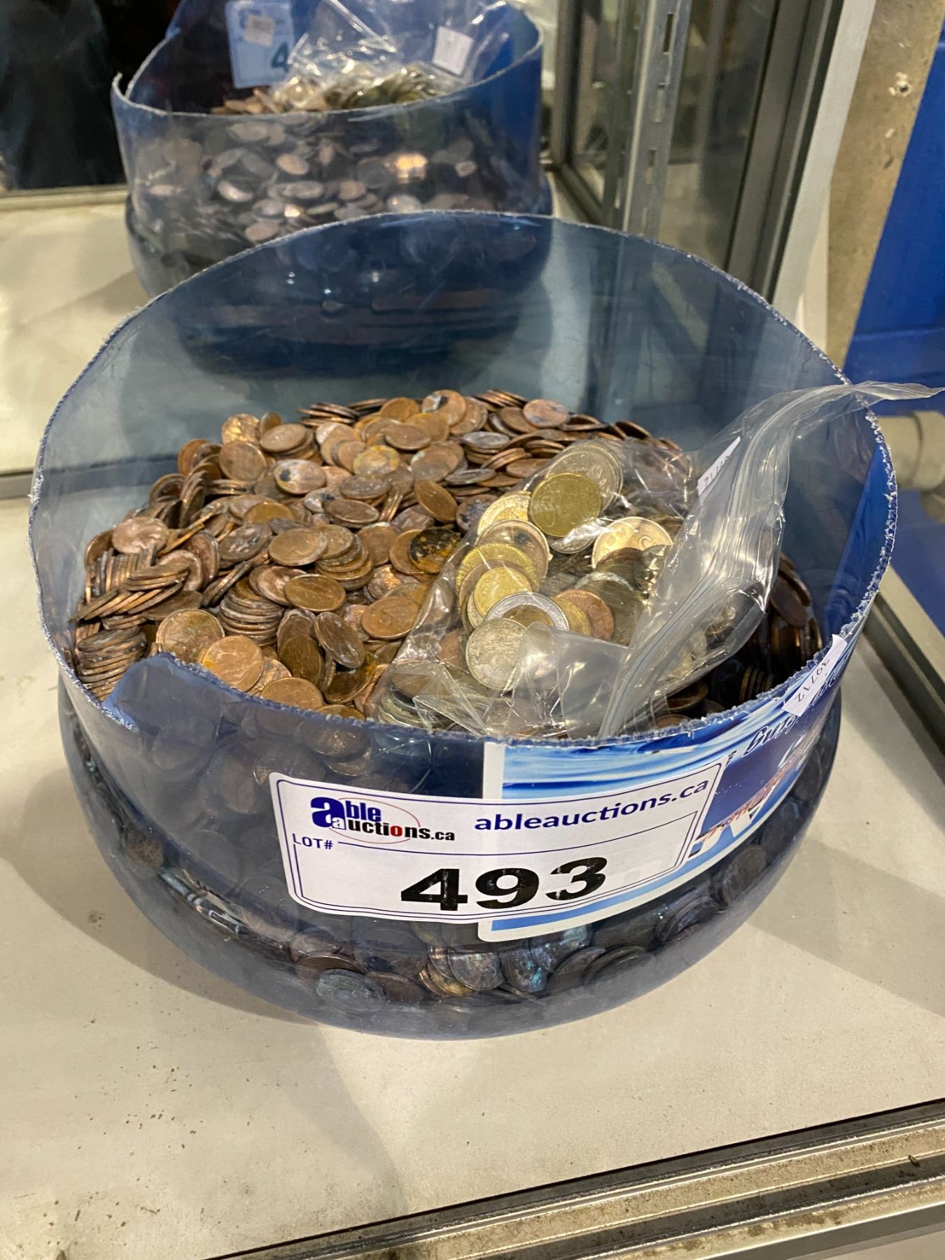 BUCKET OF PENNIES & ASSORTED COIN CURRENCIES