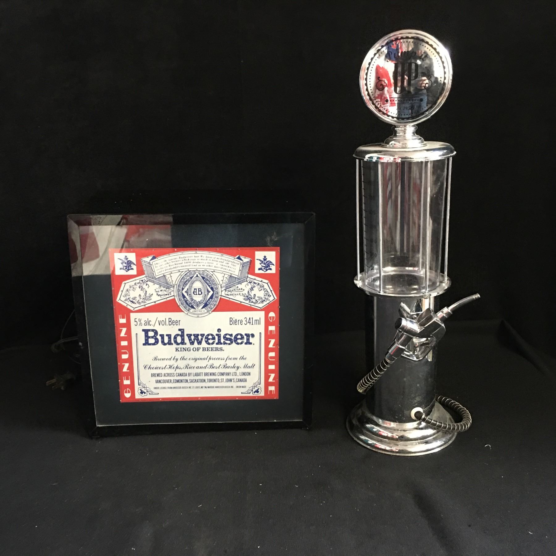BUDWEISER SHADOW BOX AND GAS PUMP LIQUOR DISPENSER LOT