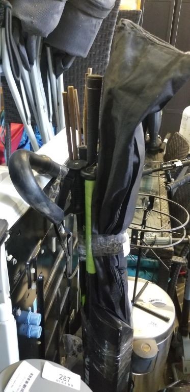 BUNDLE OF ASSORTED LOST PROPERTY ITEMS, WALKING STICK, SPEAKERS, BANNER STANDS, CRUTCH, BAMBOO ETC