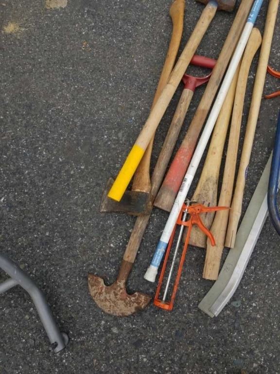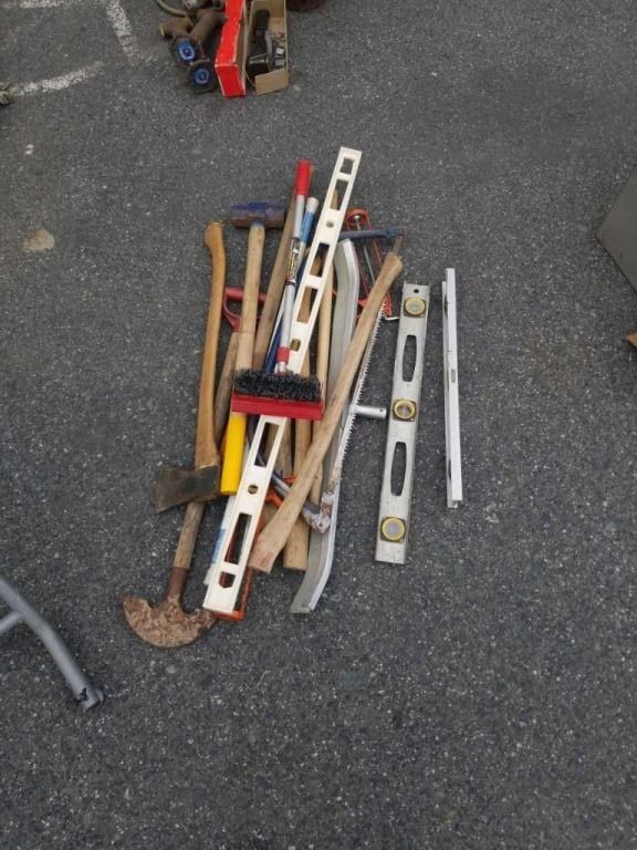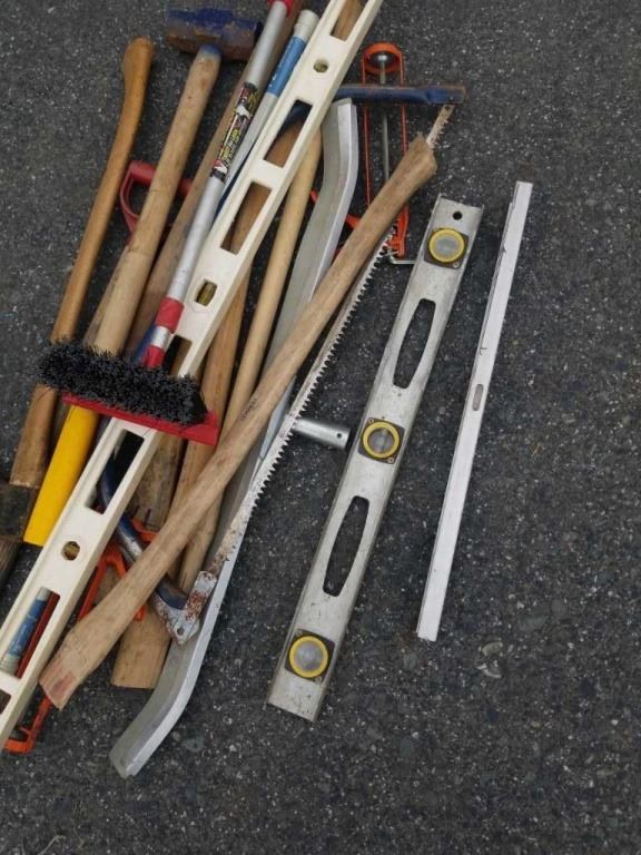 BUNDLE OF TOOL HANDLES, SLEDGEHAMMER, AXE AND LEVELS