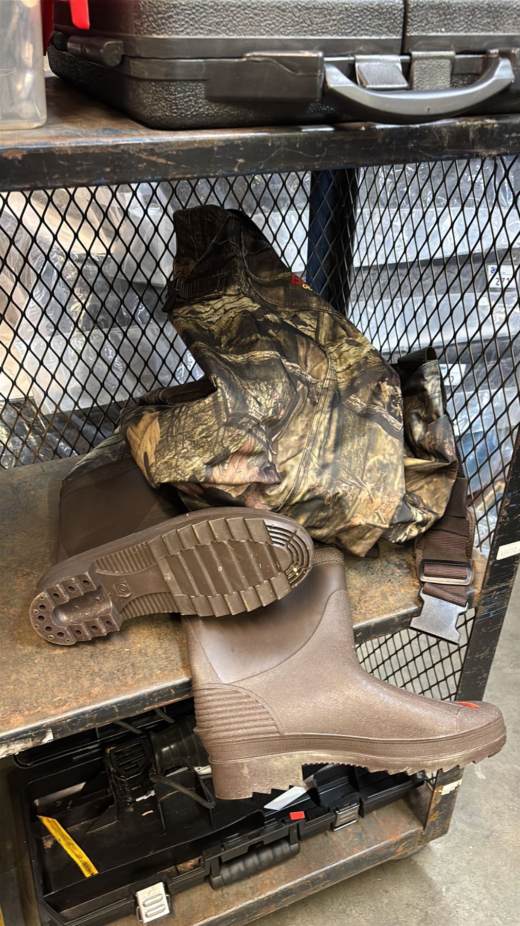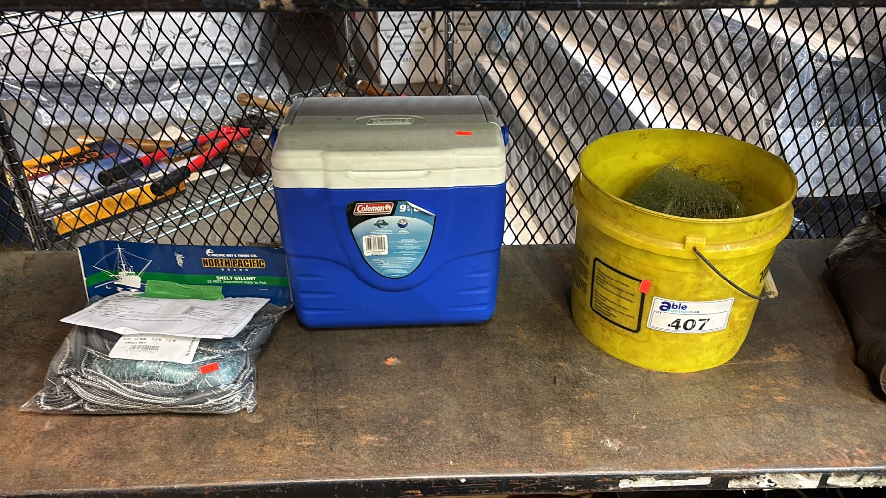 BUSHLITE CHEST WADERS, BUCKET WITH FISHING NET, COLEMAN COOLER & SMELT NET