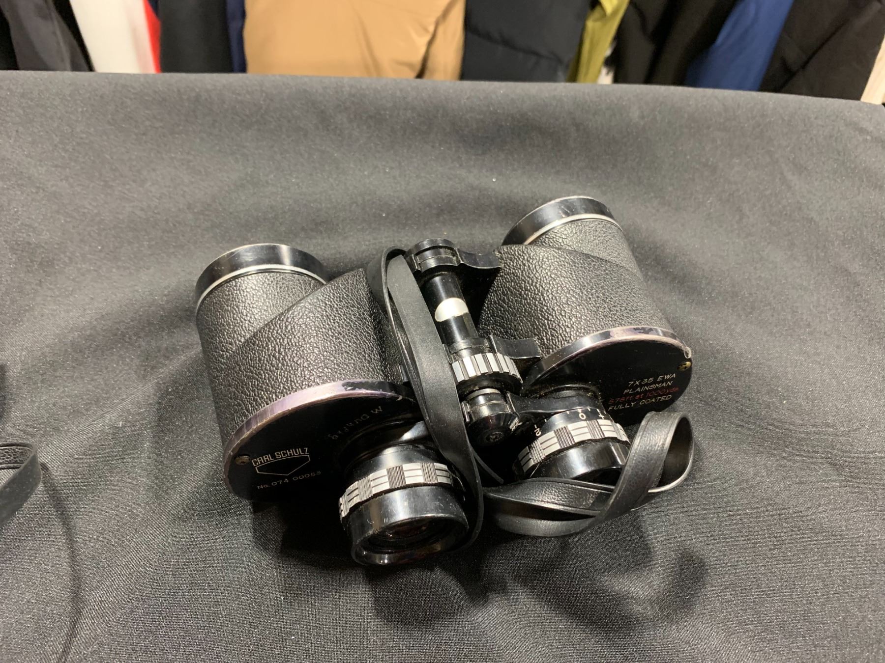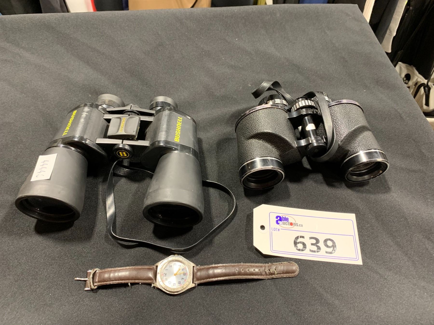 BUSHNELL 10 X 50 WIDE ANGLE BINOCULARS, CARL SCHULZ 7 X 35 ANGLE BINOCULARS & WRIST WATCH