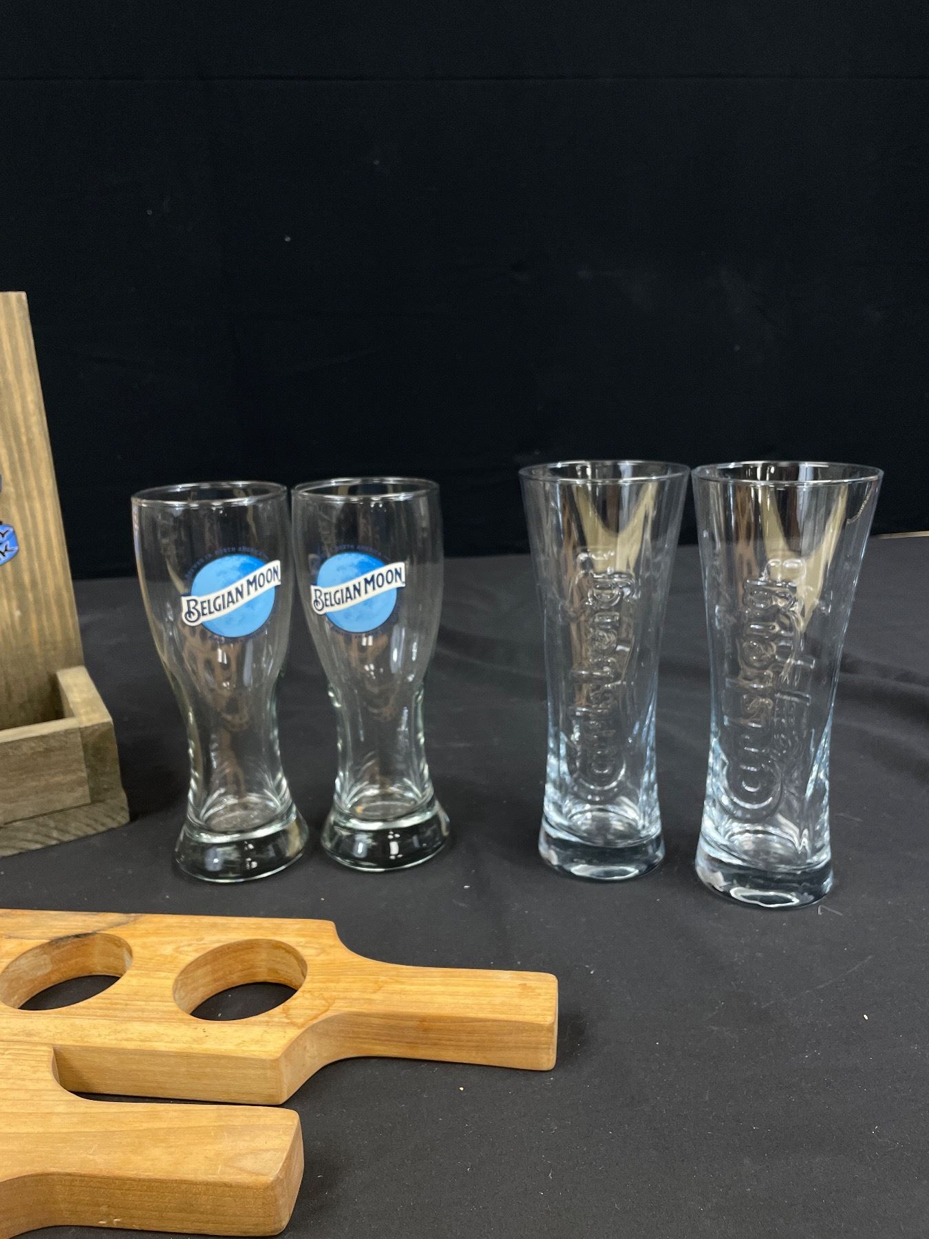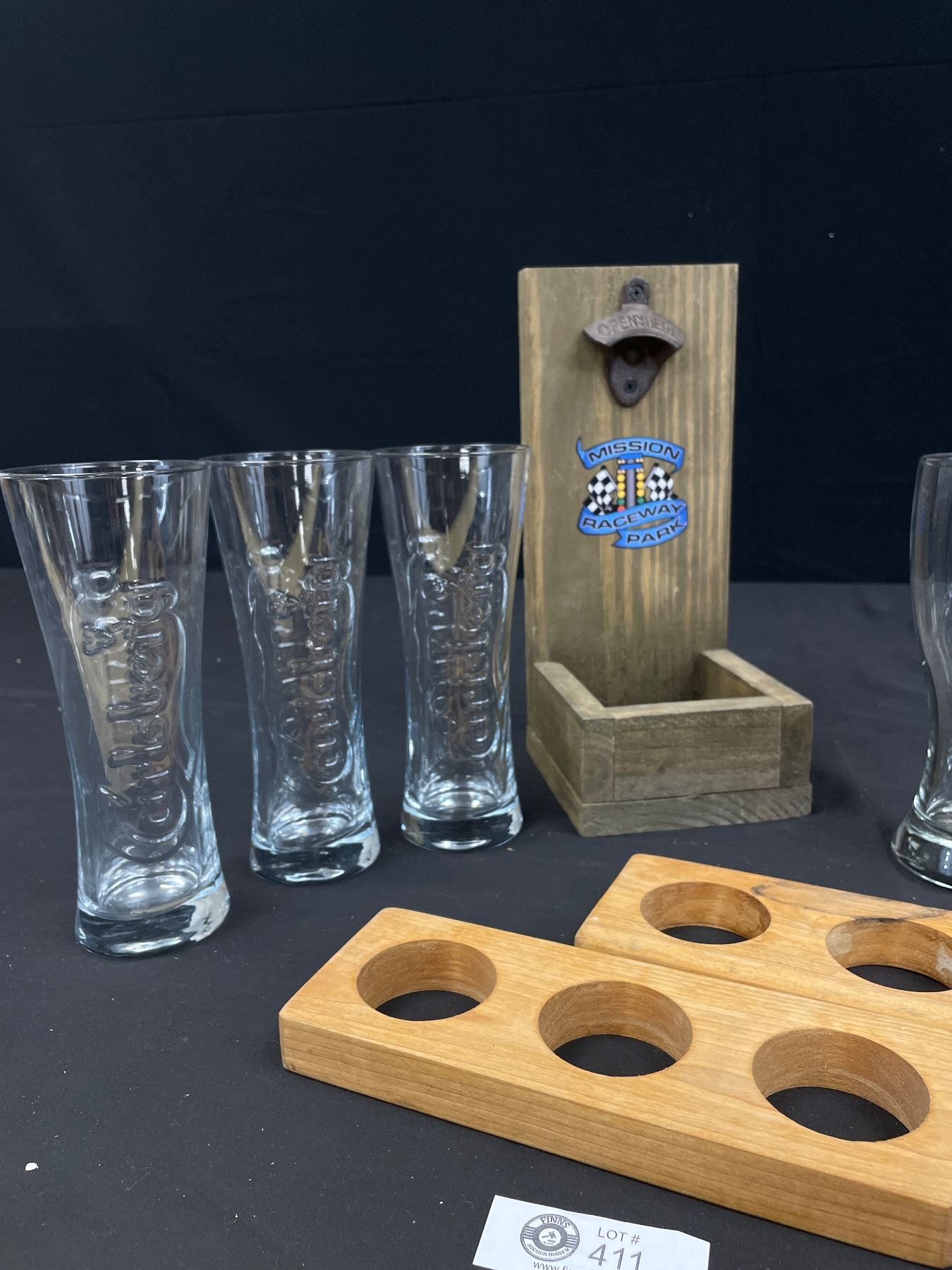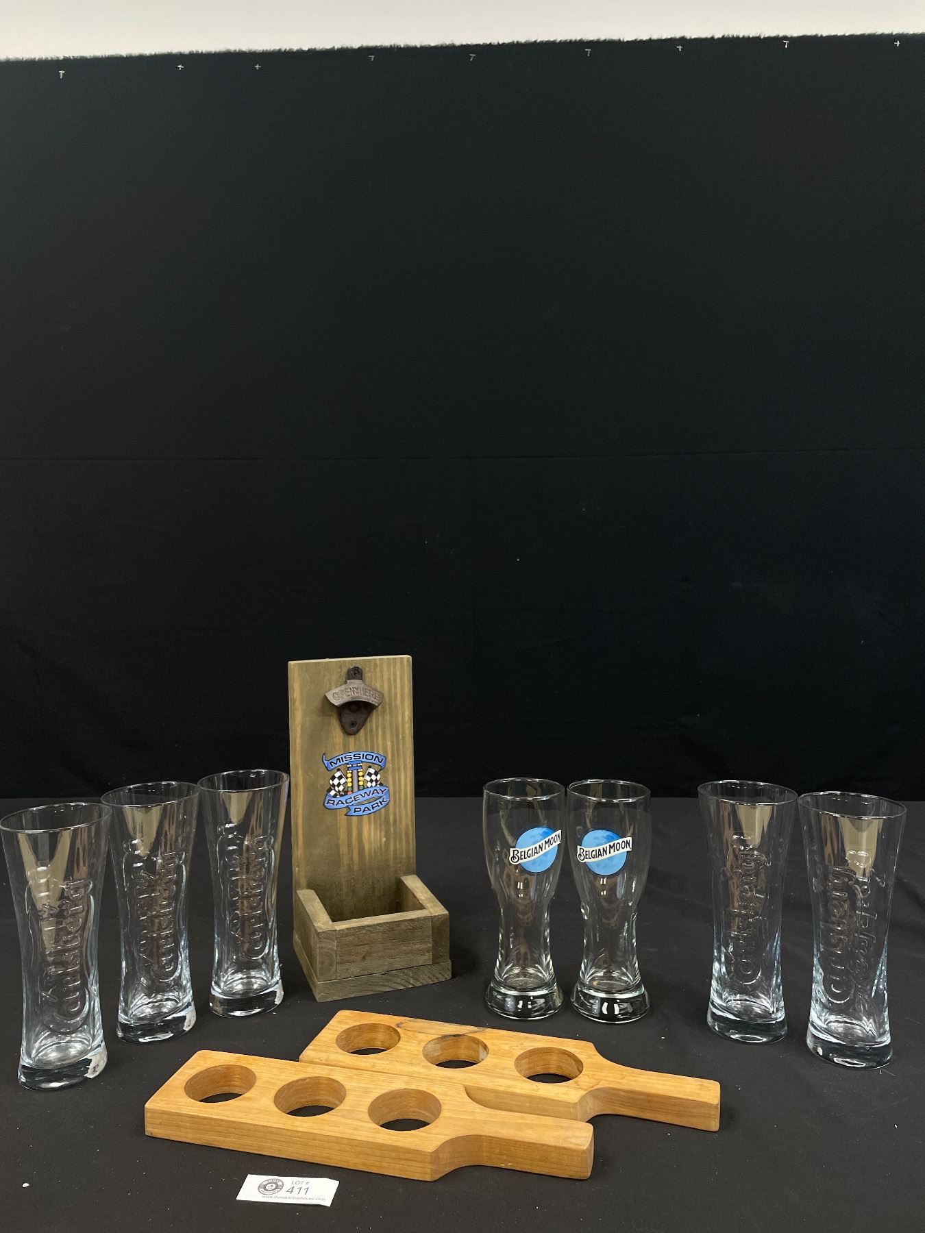 Bar Lot - Flight Holders, Mission Raceway Bottle Opener woth Lot of 7 Draft Beer Glasses