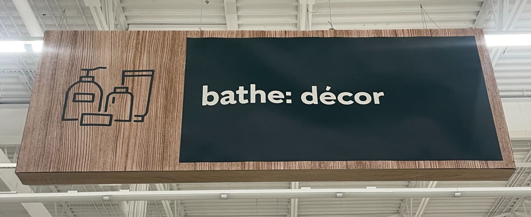Bathe: decor store sign (approx. 52in W 19in H 3in D) BIDDERS ARE RESPONSIBLE FOR ALL COSTS ASSOCIATED WITH PICKUP OF THEIR LOTS INCLUDING BUT NOT LIMITED TO RENTAL OF EQUIPMENT, FORKLIFTS, LABOUR, TRUCKING, TOOLS ETC.