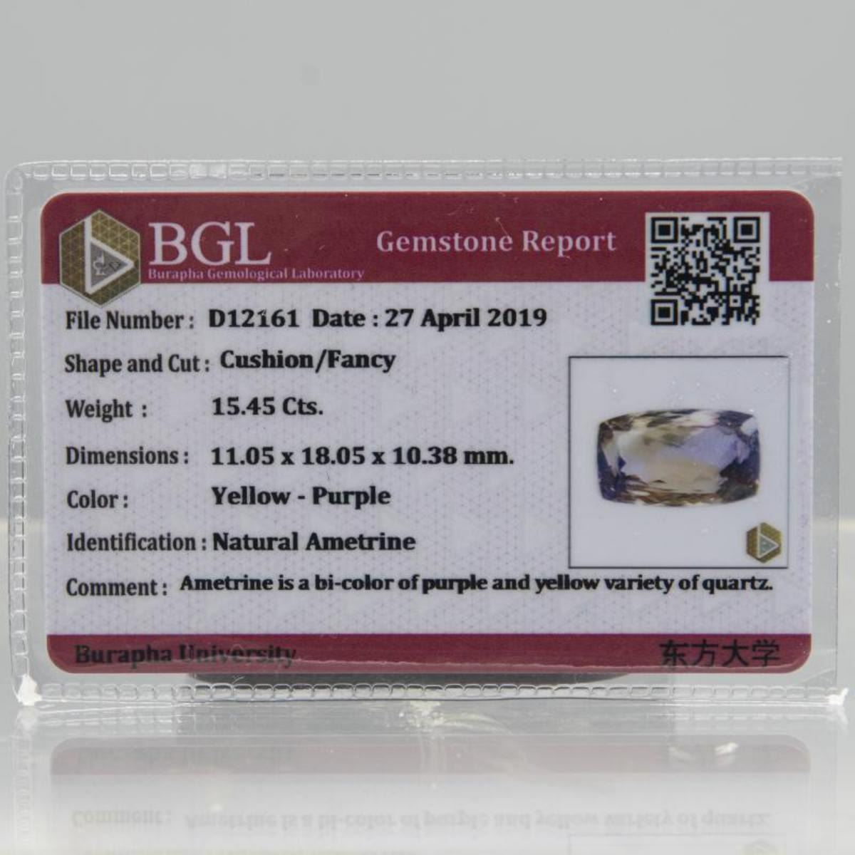 Beautiful 18 Ct Certified VVS 1 Natural Bi-Color Ametrine.Displaying a beautiful purple and gold hue along with vivid saturation and clarity.Fancy cushion cut measuring 11.05 x 18.05 x 10.38 mm..Near flawless. Abosolutely stunning.