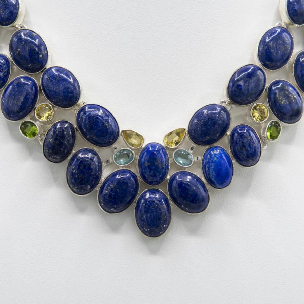 Impressive High-End 265 Ct Natural Blue Lapis Lazuli Necklace. These mined from the earth gems are highly polished with a fine bright luster. This lapis necklace is adorned with the highly desired gold pyrite accents. Mounted in solid .925 sterling silver and accented with natural sky blue topaz and citrine gemstones. 18 " long.465.5 Cttw. or approx. 60 Total Grams.