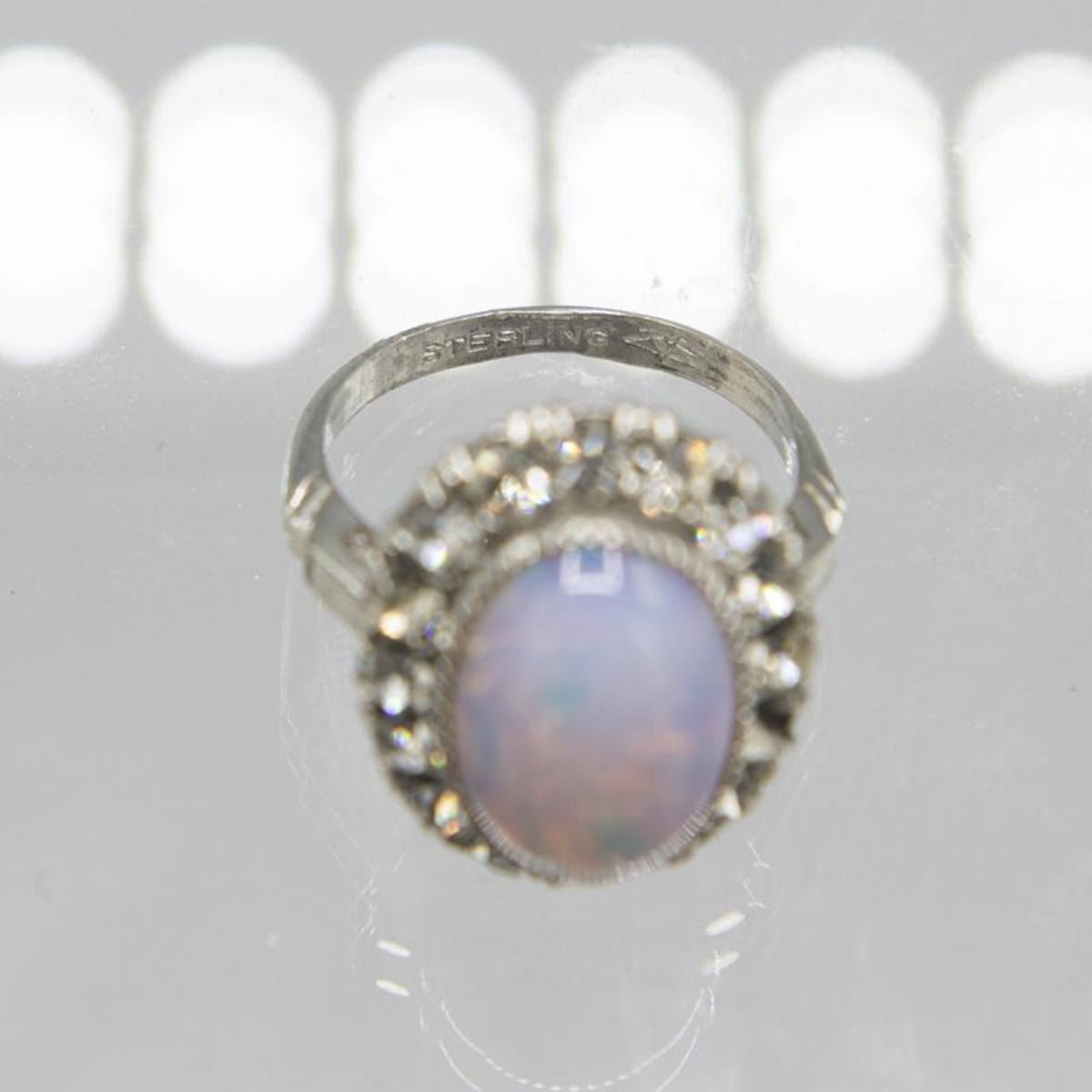 Beautiful 5.5 Ct Color Play Welo Opal Ring.This Lab Created Welo Opal is a cabochon cut measuring ,approximately 8 x 12 mm.,Mounted in solid stamped .925 sterling silver. The incredible color play of this opal bursts out but not limited to flashes of neon green, red, blue , pinks and orange. Incerdible brilliance and high luster. Sizer 6 and ready to be worn. Total Gram Weigt Is 4.5 Grams. Simply Fabulous To Gaze At.