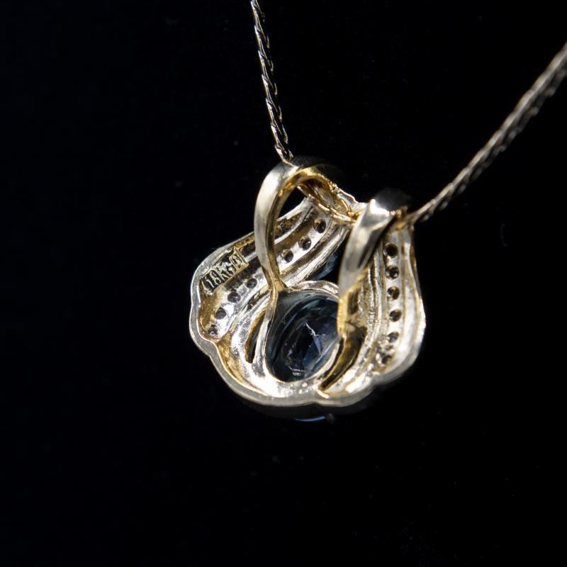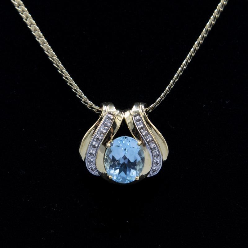 6.12 Ct Swiss Blue Topaz & Diamond Pendant. VVS 1 Near Flawless Faceted Oval Cut Measuring 12 x 10 mm.100 % Natural.Unheated.Treatments: None.Includes 16 Natural Faceted Diamond Accent Stones. Mounted in18 Kt. Gold Overlay.Length is 18" weighing 12.9 Total Grams.Get Ready For The Compliments On This One.