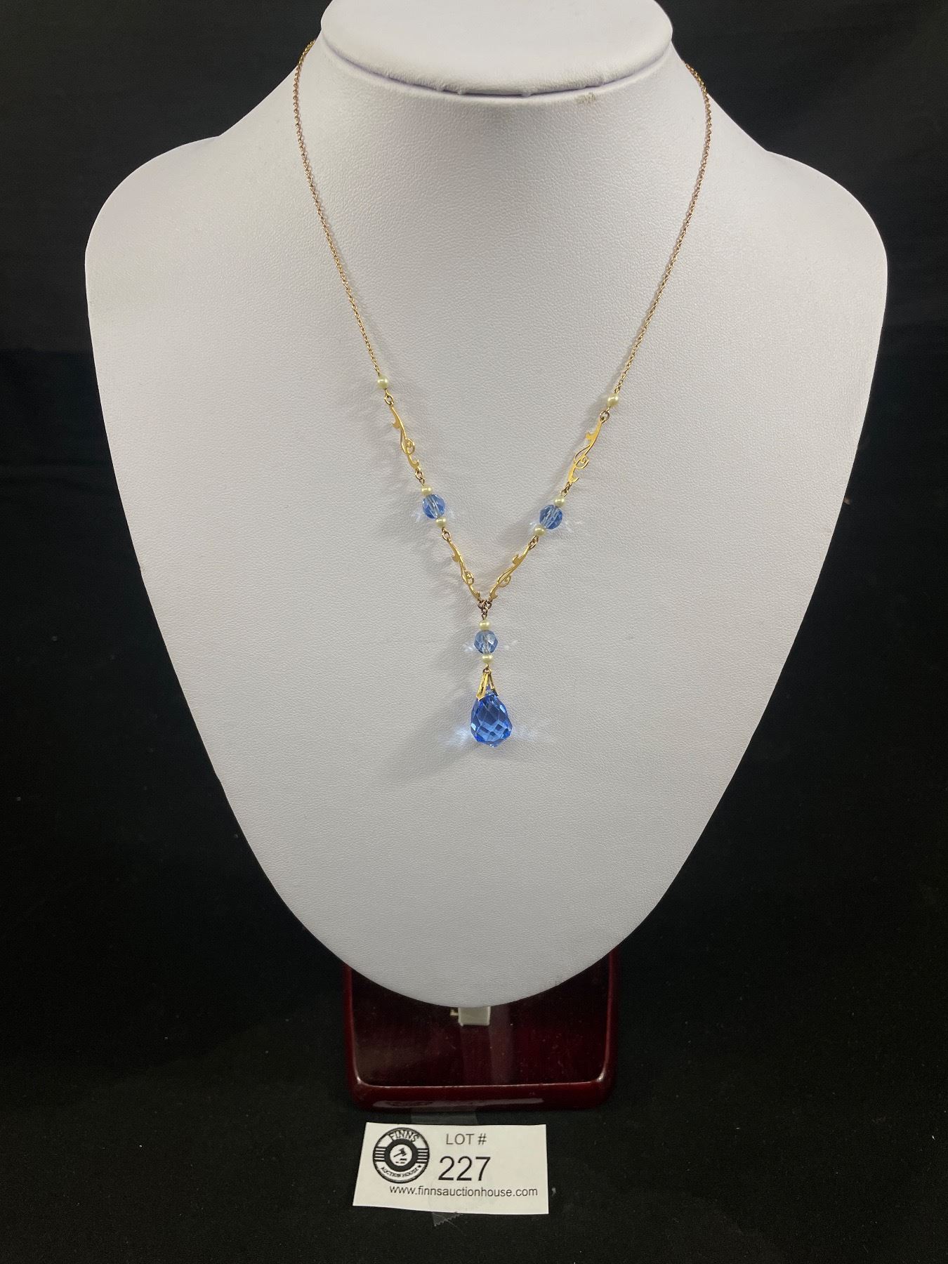 Beautiful Antique 9K Yellow Gold Necklace w/Blue Faceted Crystals & Pearl Accents