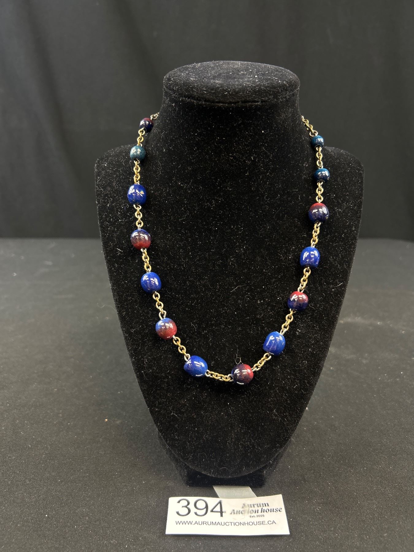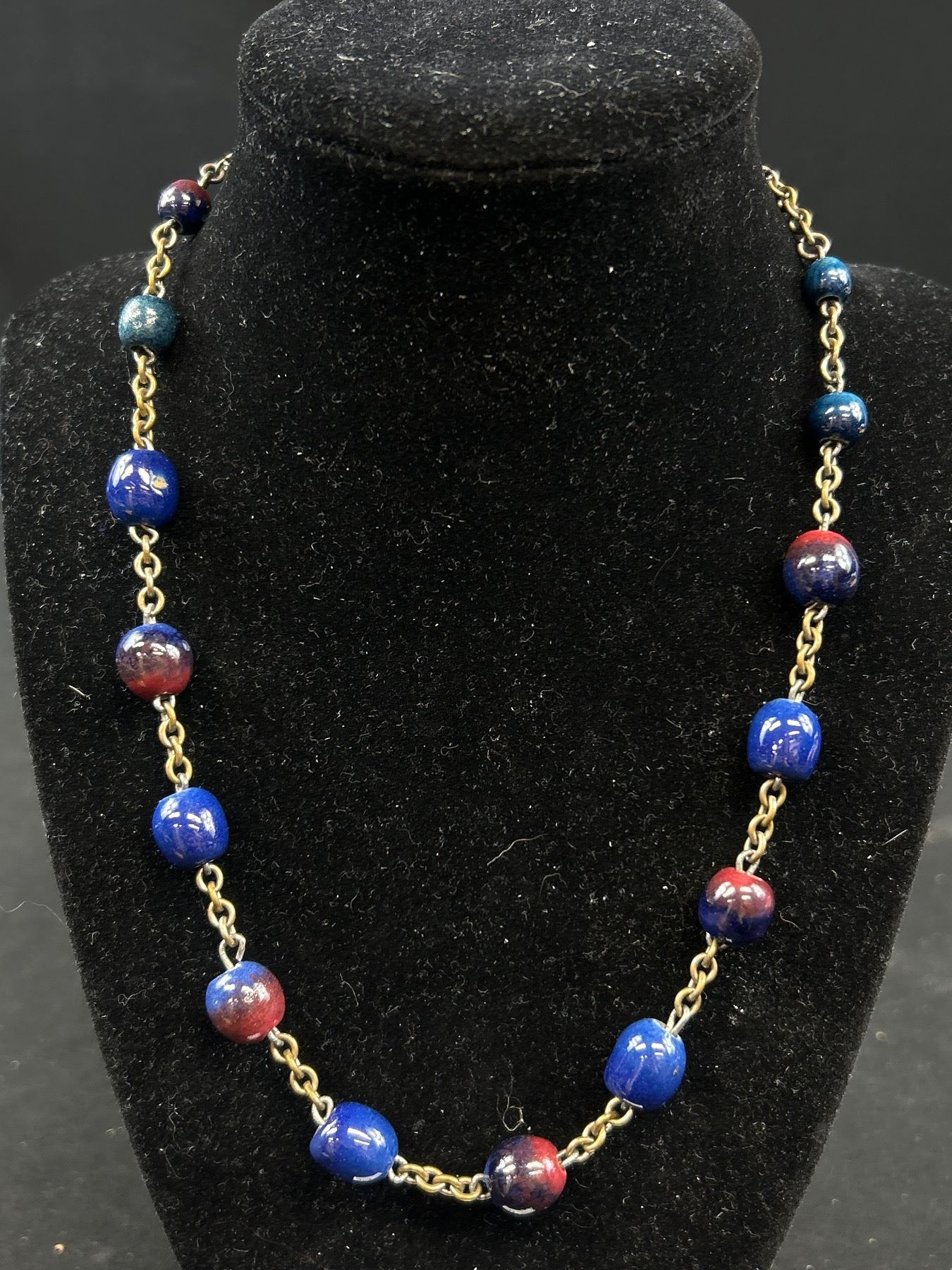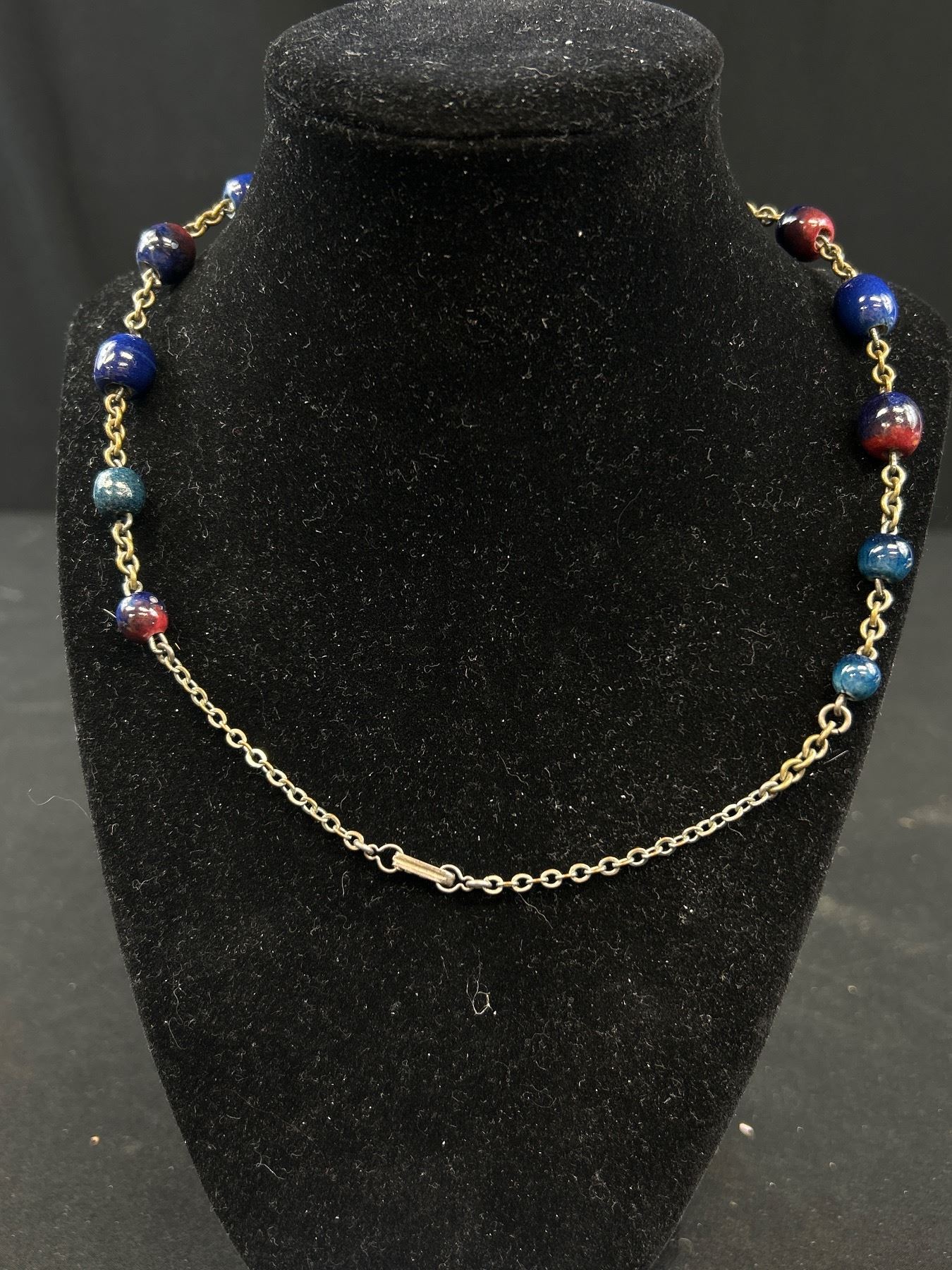 Beautiful! Antique Art Deco Peacock Glass Silver Bead Necklace