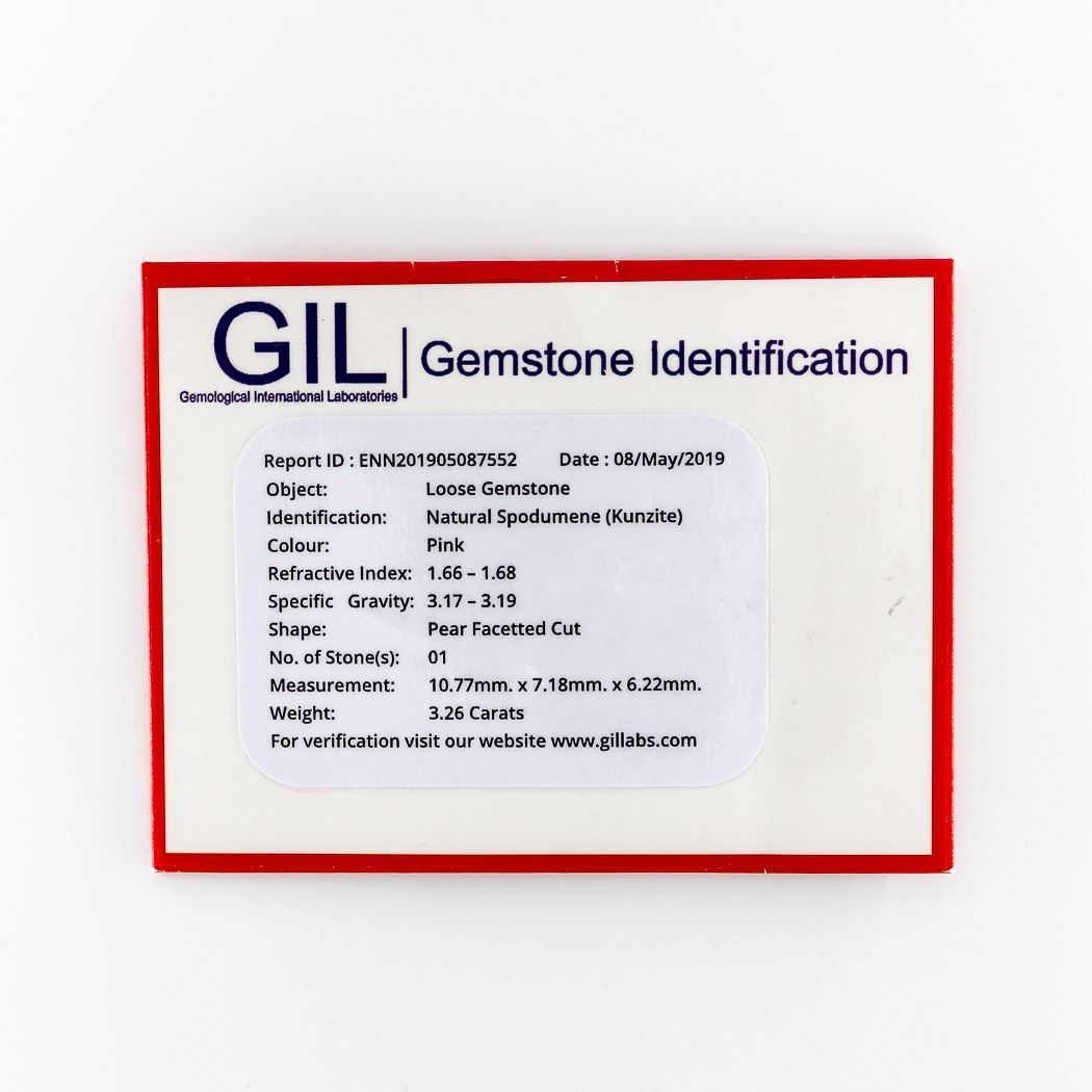 Beautiful Certified 3.26 Ct Pink Kunzite Loose Gemstone.Fine pear cut measuring 10.77 x 7.18 x 6.22 mm.Origin : Afghanistan. Heat treated only. Please see certifications for further details
