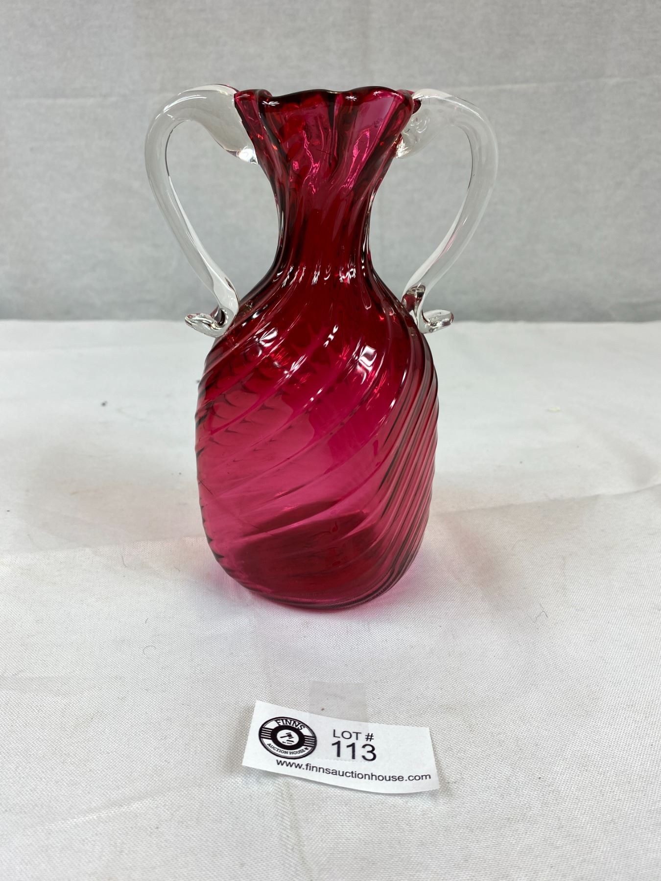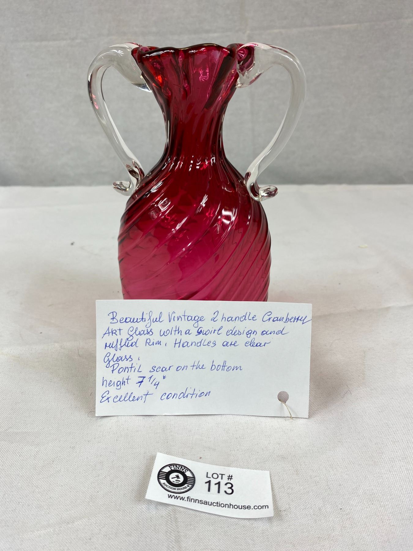 Beautiful Vinatge 2 Handle Cranberry Art Glass with a swivel design and ruffel rim excellent condition 7.25 High