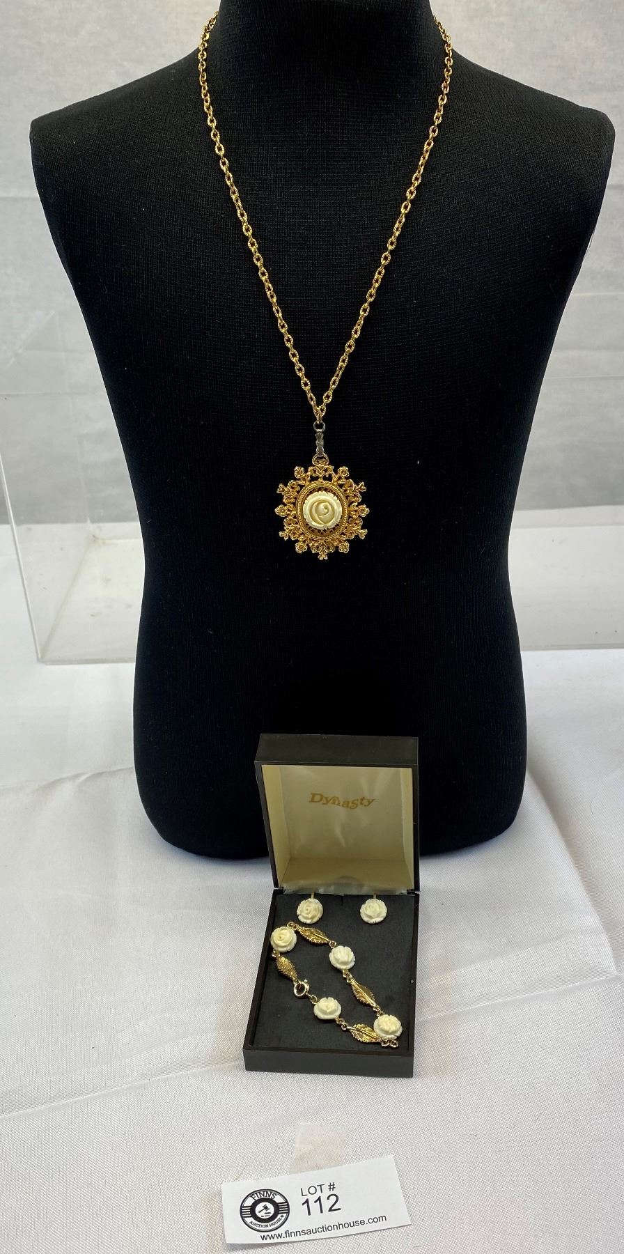Beautiful Vintage Carved Rose Necklace, Bracelet And Earrings Set