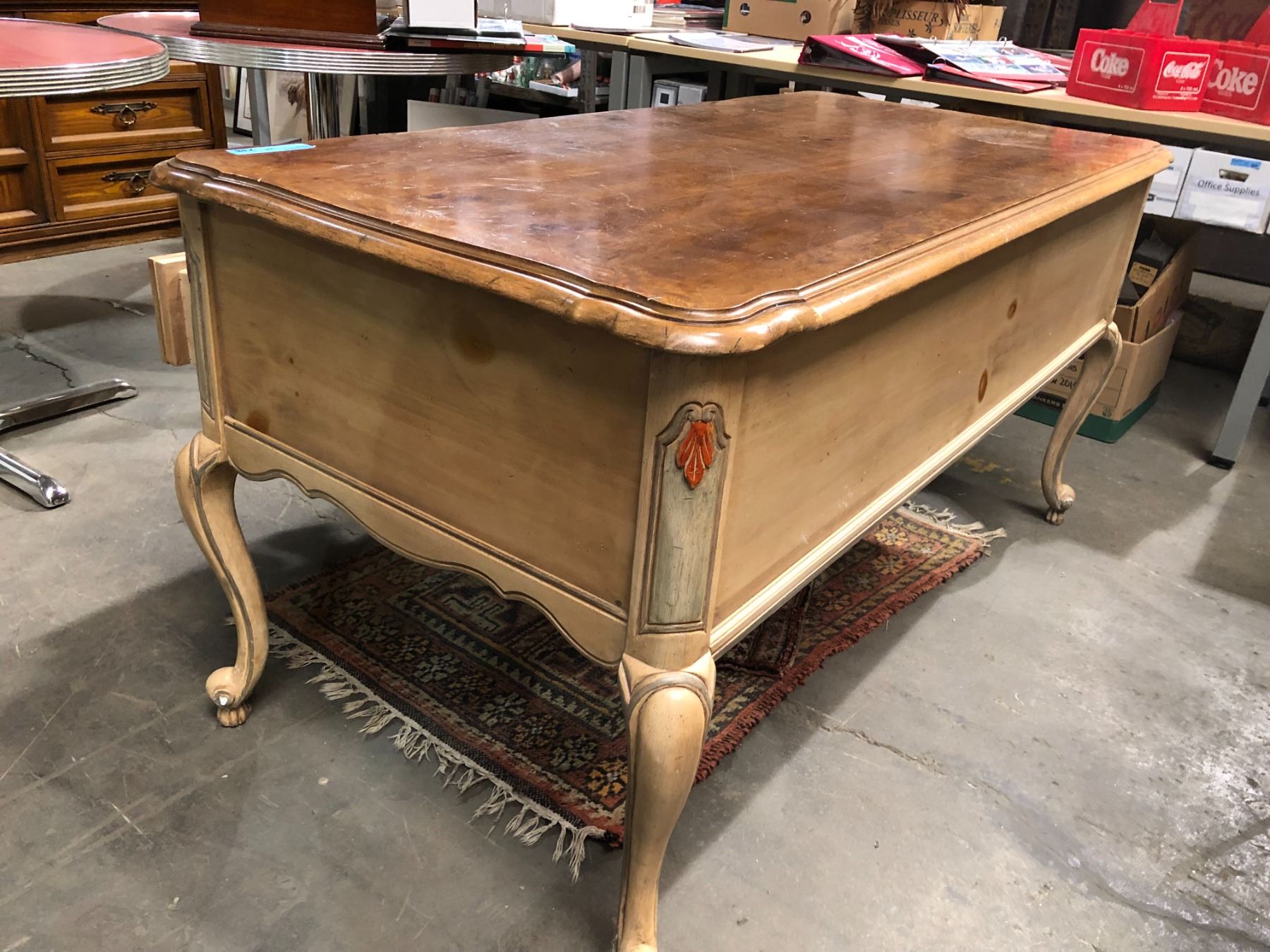 Beautifully crafted French inspired pine w/burl inlay top 5 drawer writing desk