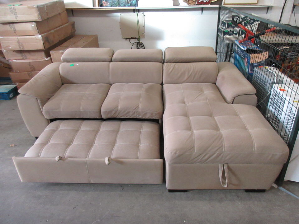 93" wide with a 63" long chaise end. Customer return. Needs cleaning. As is.