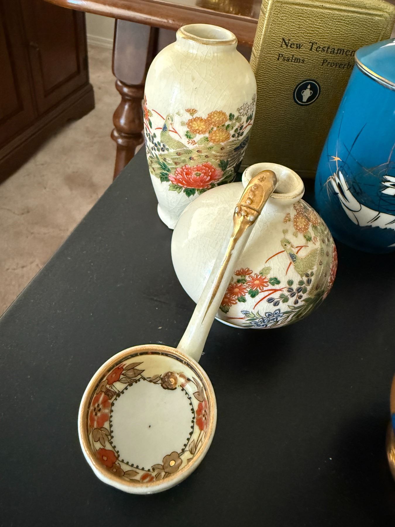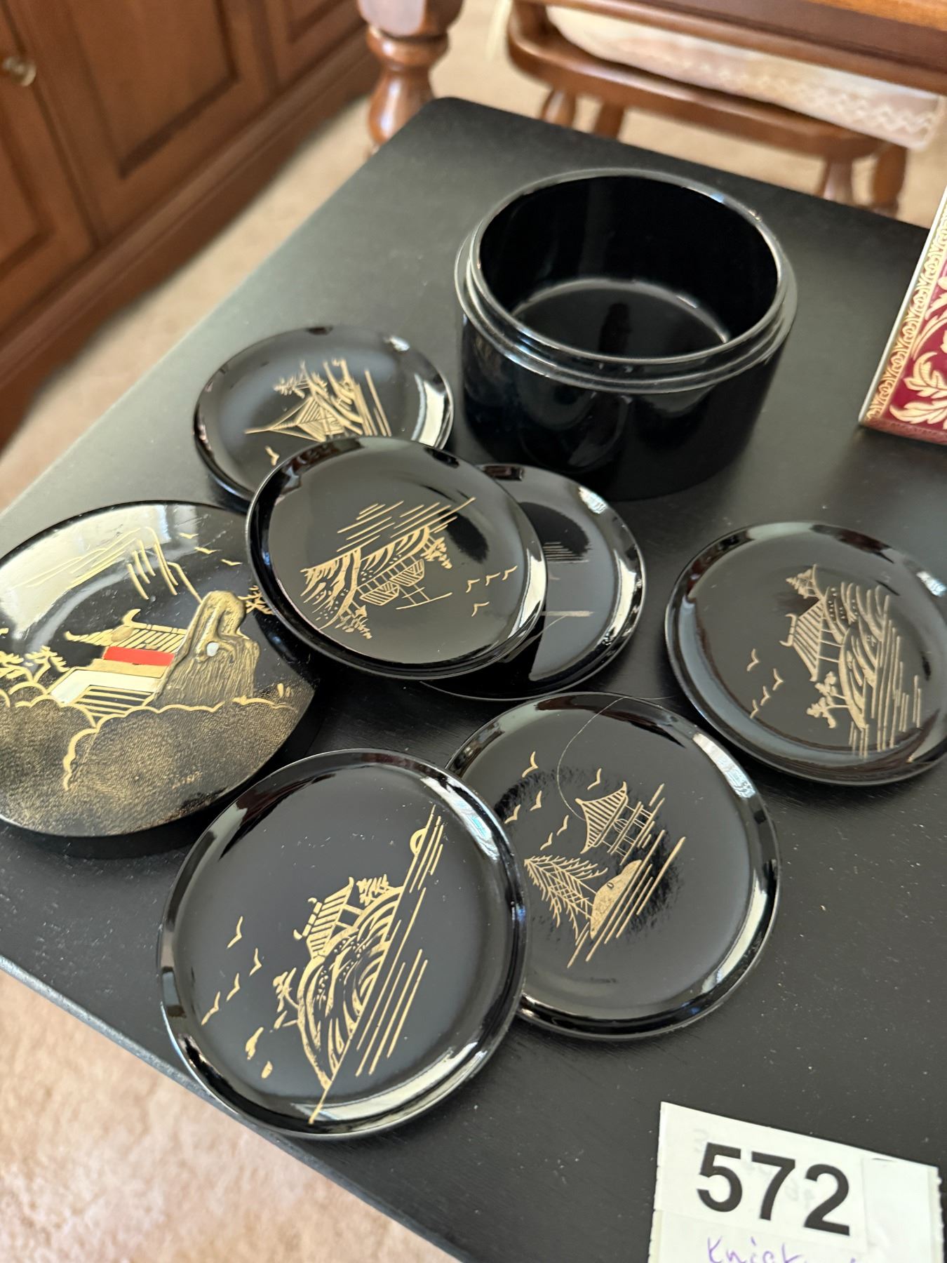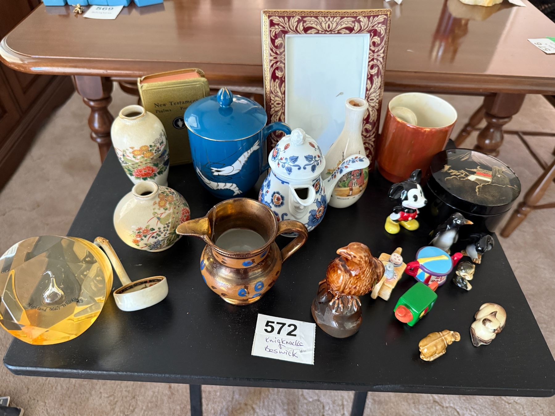 Beswick eagle, décor, lidded tea cup, Asian lacquered coasters and more. Repair in creamer.