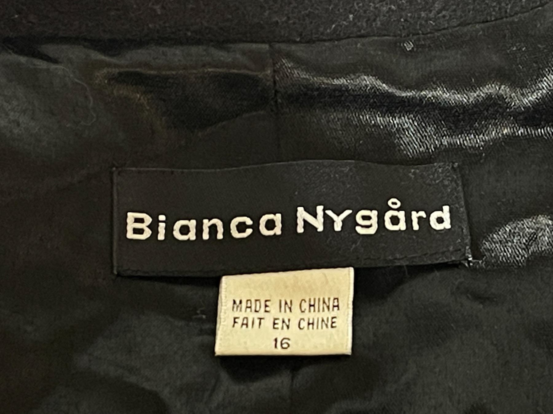 Elegant full-length black wool and cashmere blend coat by Bianca Nygard, featuring a double-breasted front, classic lapels, and a flowing silhouette reminiscent of an opera coat. Lightweight yet refined, it drapes beautifully for formal or evening wear. In very good condition with light wear consistent with age.