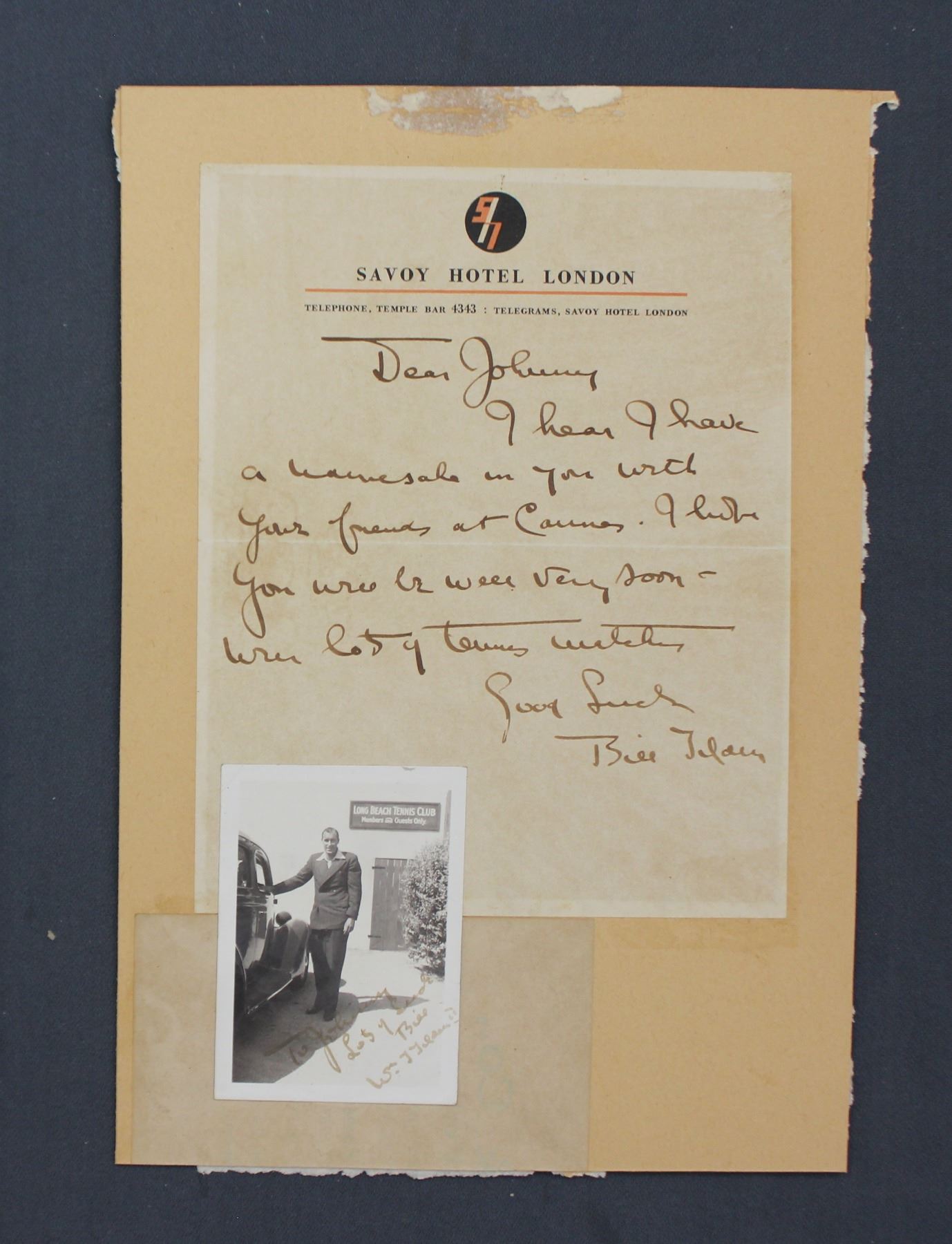 Bill Tilden Letter Signed on Savoy Hotel Letterhead. One page, 7 7/8" x 6 1/8"; With Photograph.