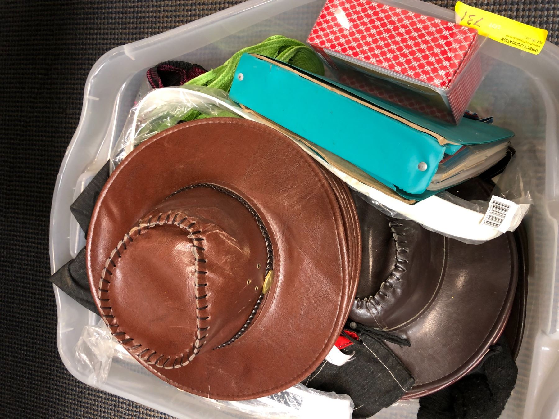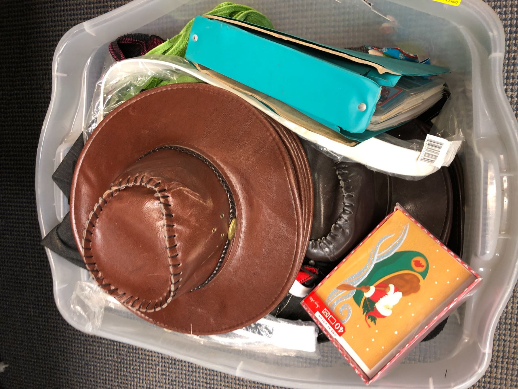 Bin Full of Leather Hats, Hockey Cards and other Estate Items - new and used