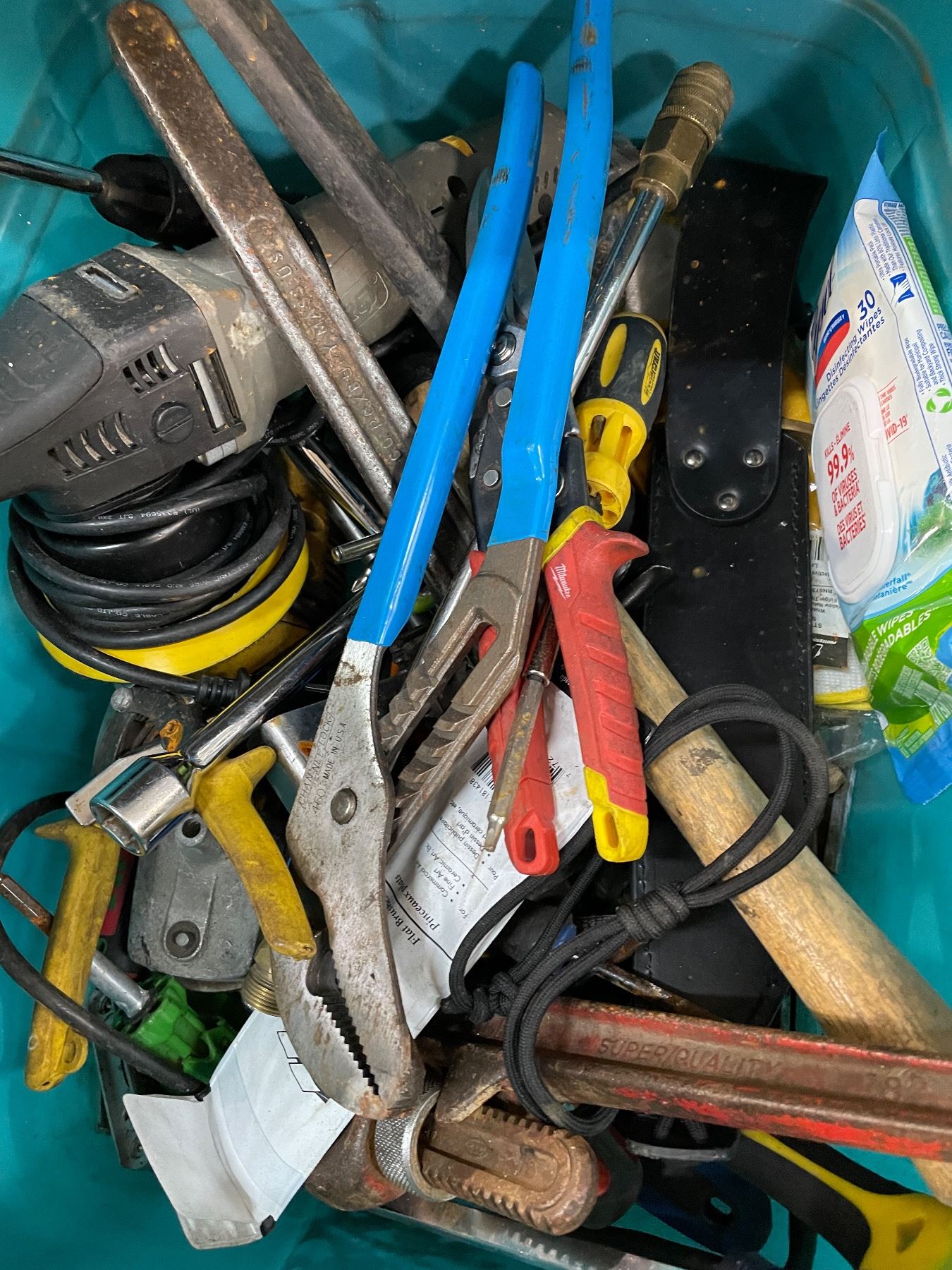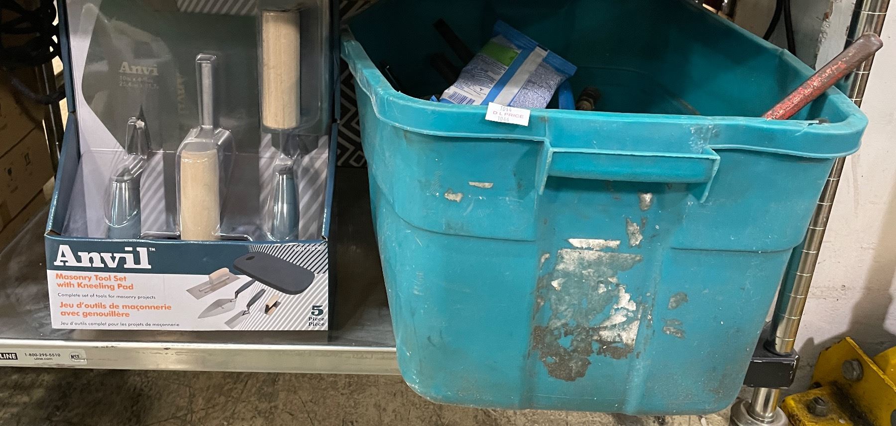 Bin of assorted tools w/ Anvil masonry tool set w/ kneeling pad