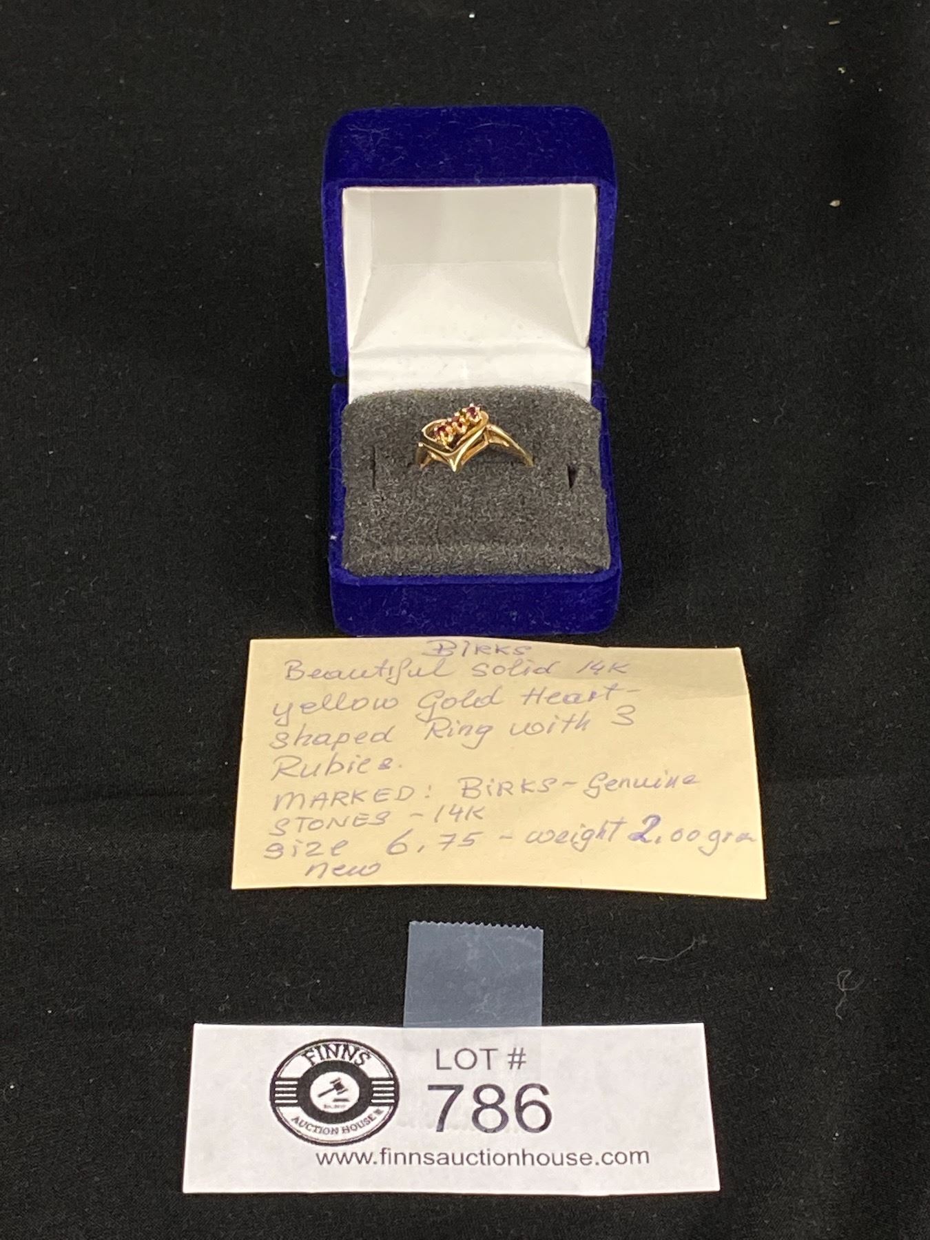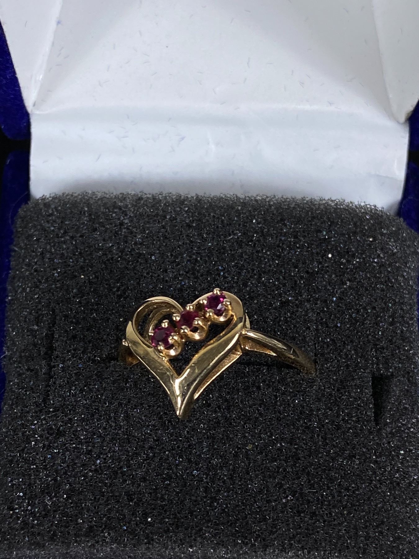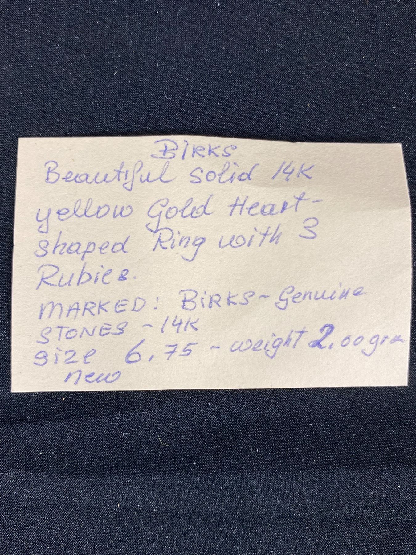 Birks Beautiful Solid 14K Yellow Gold Heart Shaped Ring with 3 Rubies Size 6.75