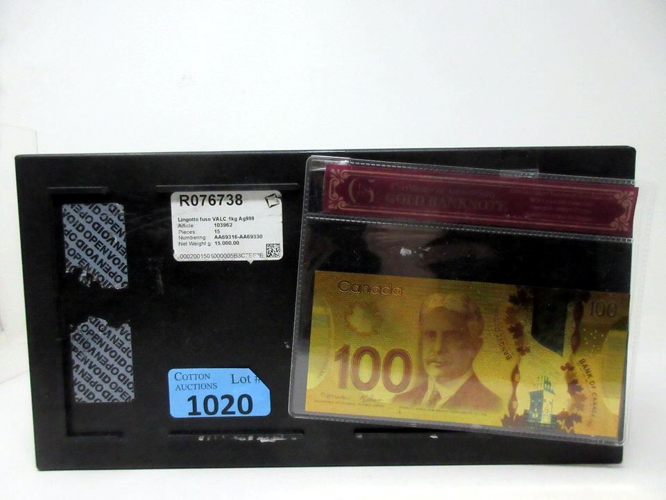 Gold plated Canadian novelty note. Bullion box measures 6.5" x 12" x 2.5" tall.
