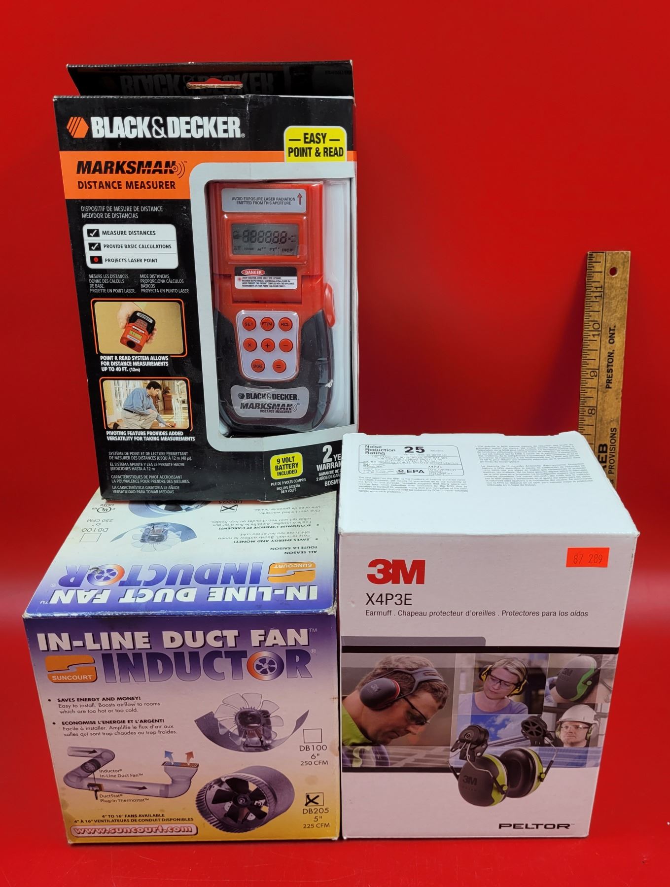 Black & Decker Marksman Distance Measurer, Suncourt In-Line Duct Fan, & 3M Earmuffs