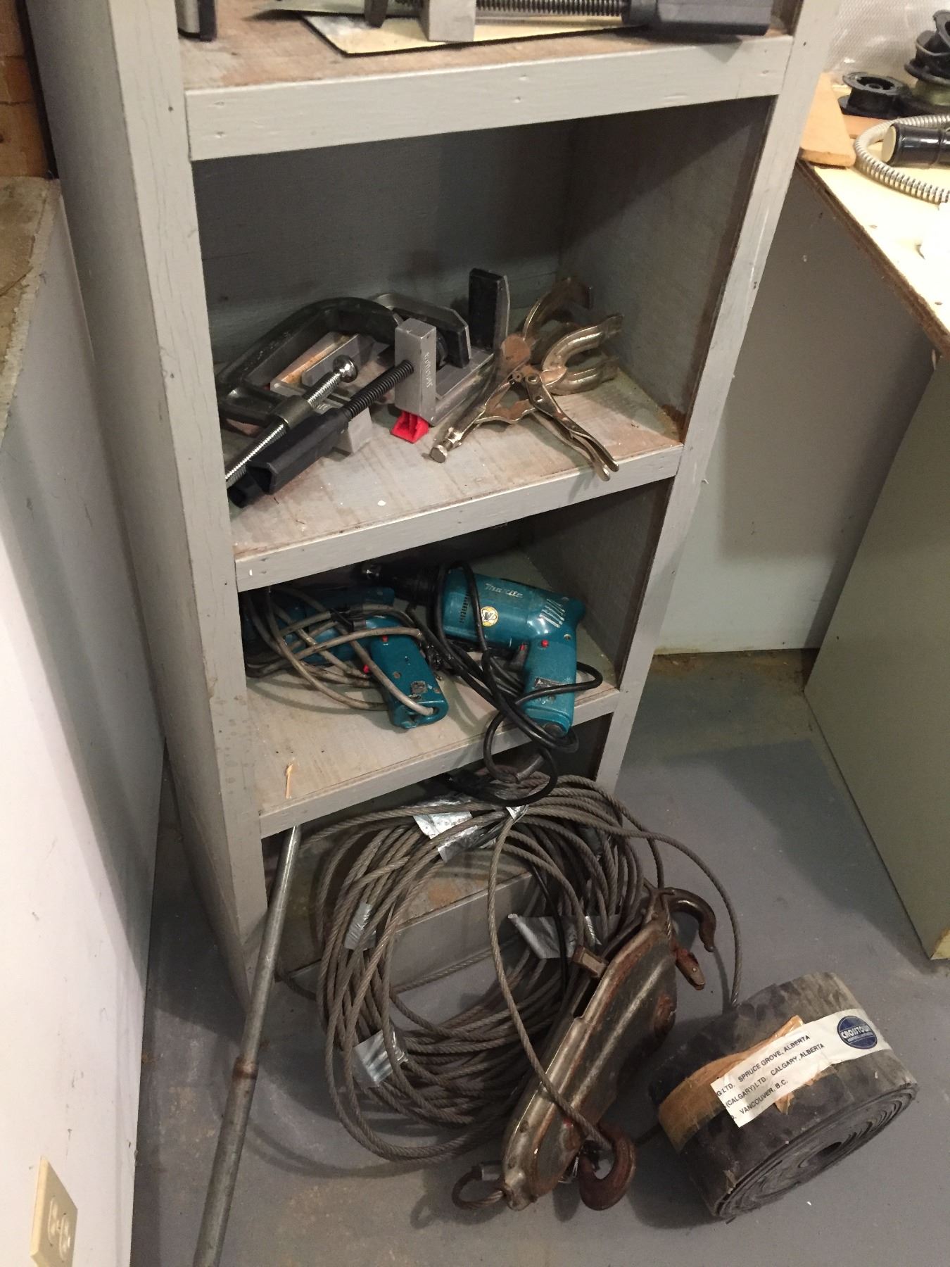 Black & Decker mouse sander MS500 untested, painted wood shelving, clamps, Mitkita drill, untested and more. Bring packing material & help to remove shelving. Come to pickup at Category C time slot, (11:00 am to Noon)