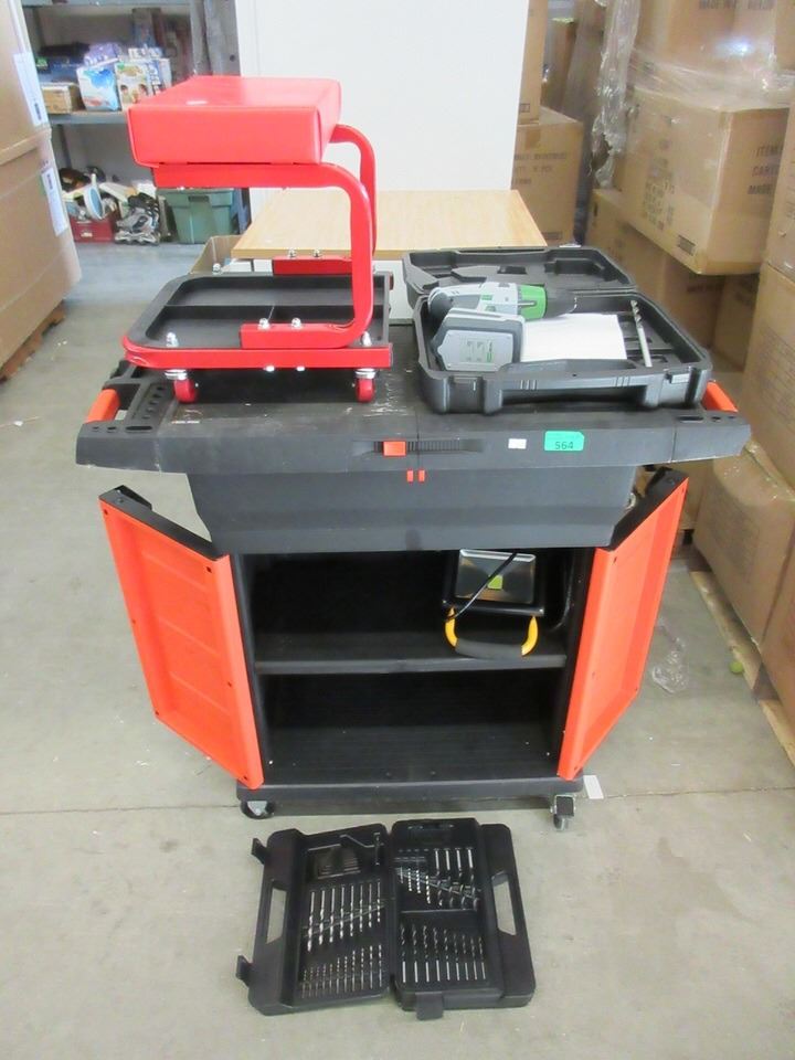 Drill, bit set, shop light and rolling stool.
