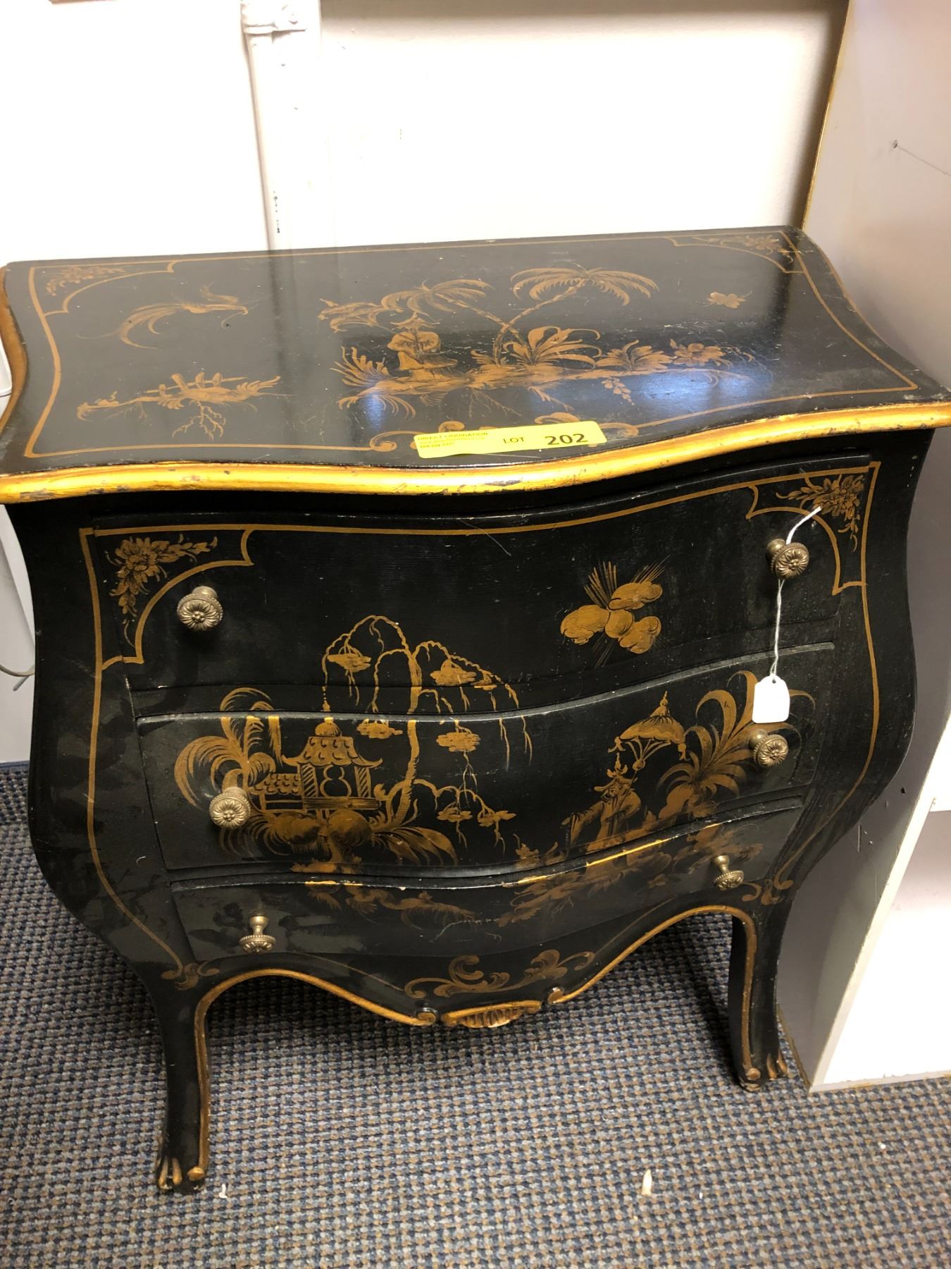 Black and Gold Lacquered - 3 drawer cabinet - hand painted Asian design.