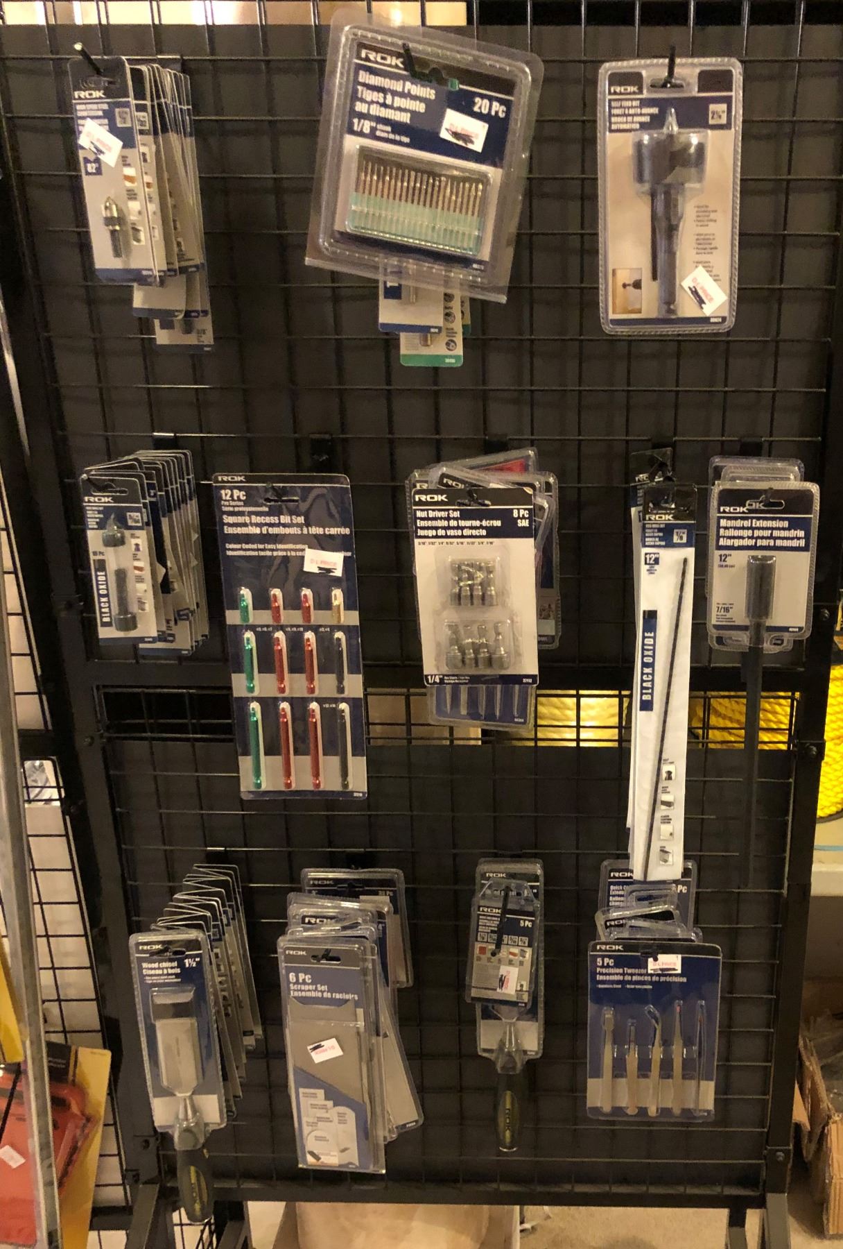 Black metal rack filled w/ assorted new items - nut driver sets/ mandrel extensions/ square recess bit sets/ wood chisels etc. - approx. 120 pcs.