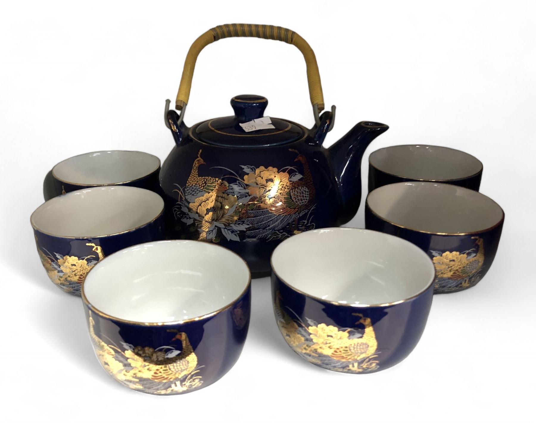 Blue Peacock Tea Set With Teapot And 6 Cups