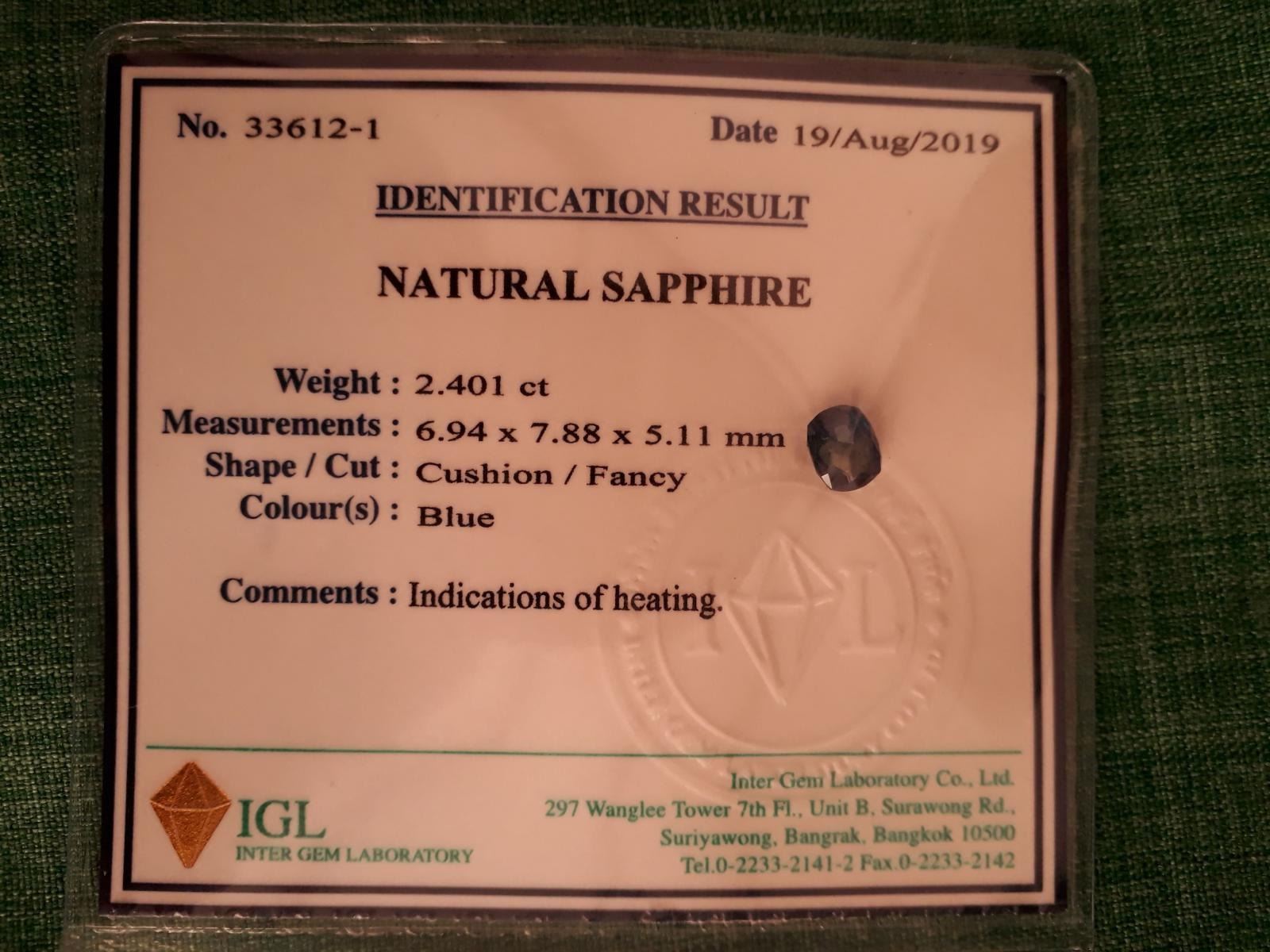 loose faceted precious sapphire, brand new without tags from Sri Lanka. GEMSTONE TYPE: Genuine Sri Lanka, Ceylon sapphireRECOMMENDED JEWELRY SETTINGS: Men Rings, Men Jewelry, Women Vintage Rings, Art JewelryCERTIFICATE: IGL/GIA Lab Brief included. Any other custom certificate paid by the buyerORIGIN: Sri LankaCARAT SIZE: 2.401DIMENSIONS: Length 6.94 x Width 7.88 x Depth 5.11 mmSHAPE/CUT: premium handcrafted freehand checkerboard finish, cushion rectangular cutTREATMENTS: heatedCOLOR/COLOUR: 25% OFF:BlueGIA COLOR CODE: BCLARITY: VS (eyeclean)SATURATION: 4=mstTONE: 4=mlFINISH & POLISH: excellent