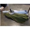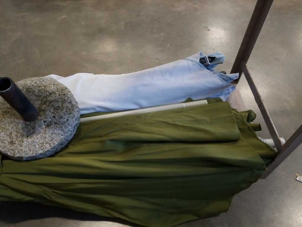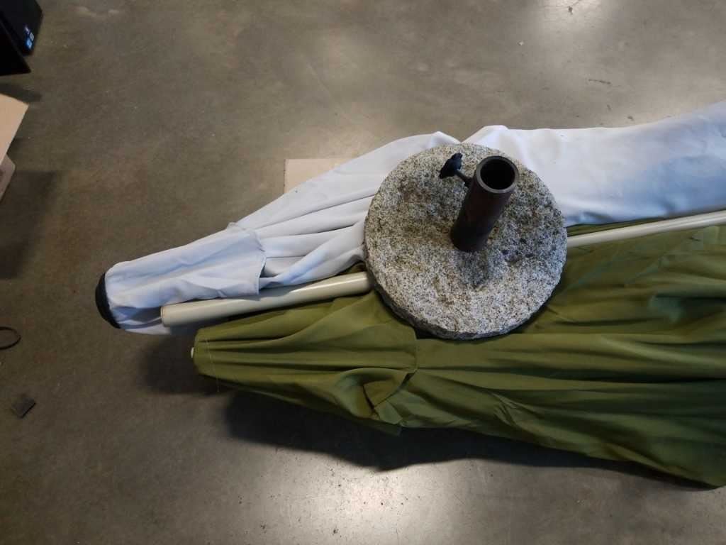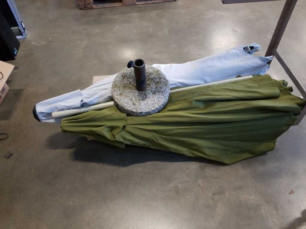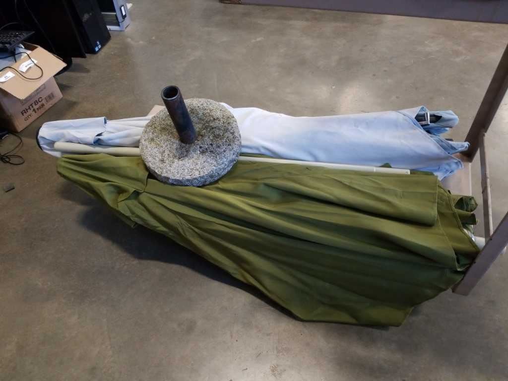 Blue crank patio umbrella with cement base and green patio umbrella