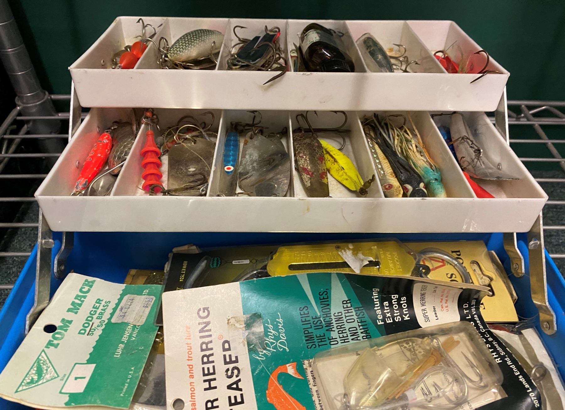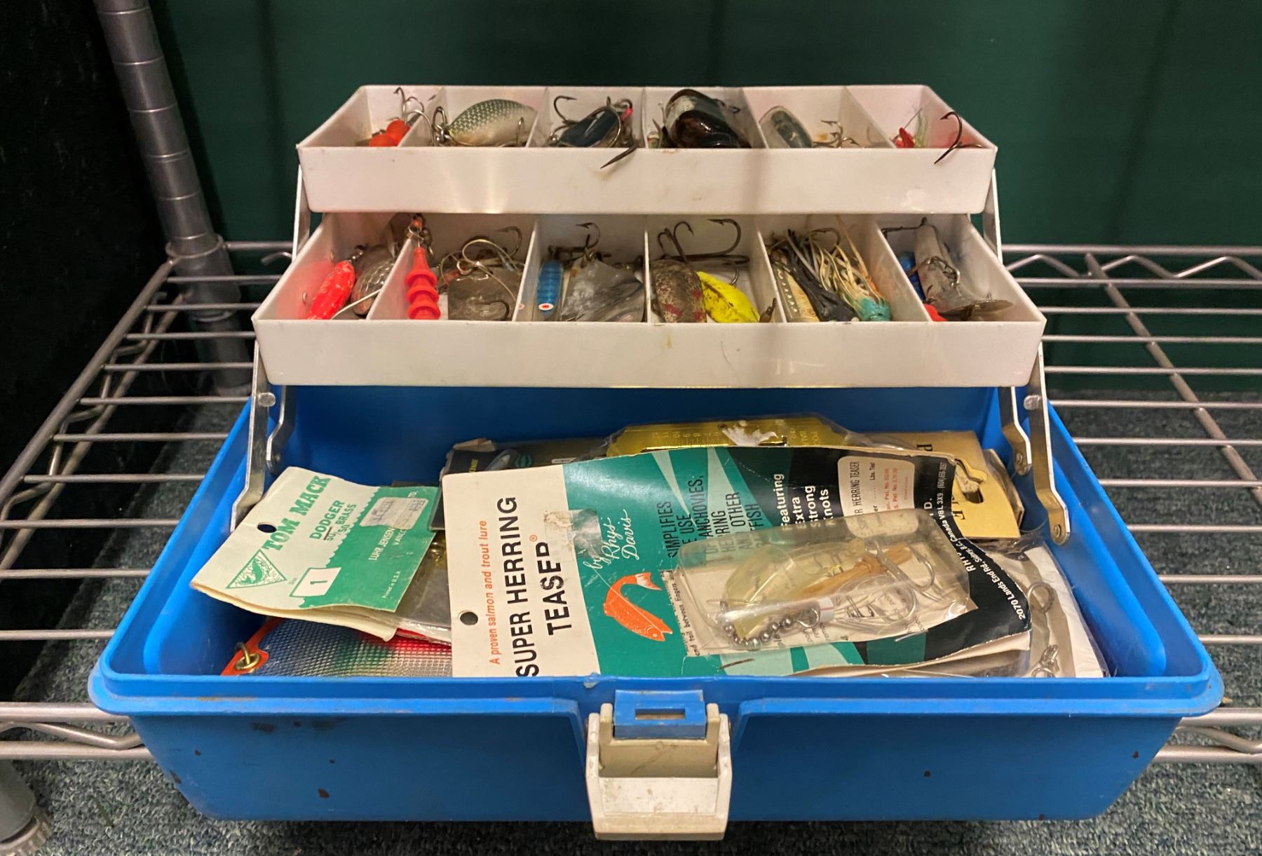Blue tackle box & contents (mix of fresh water & ocean tackle)