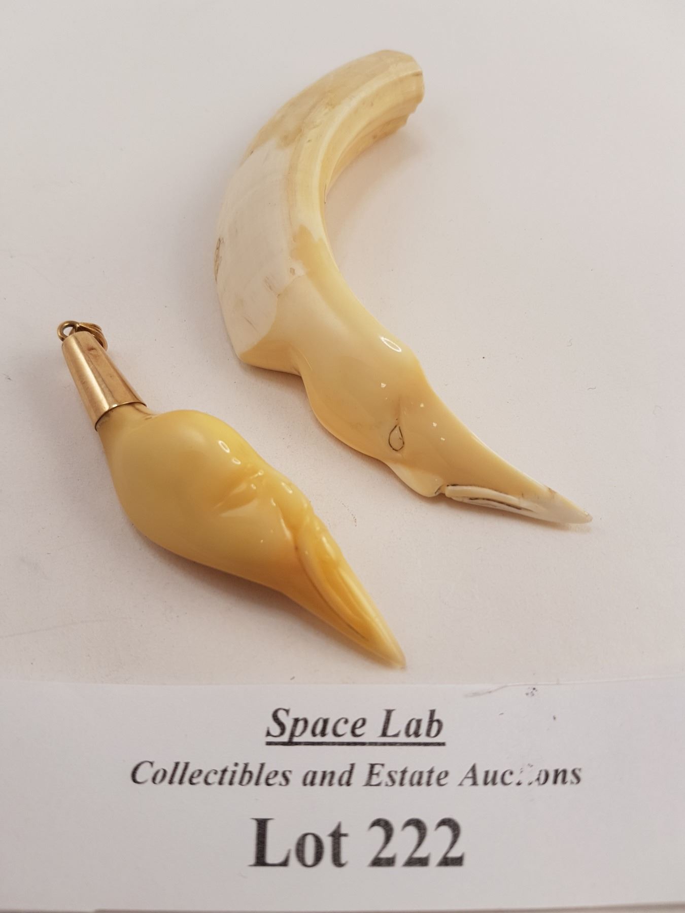 High quality carvings of human face on small boar tusks.