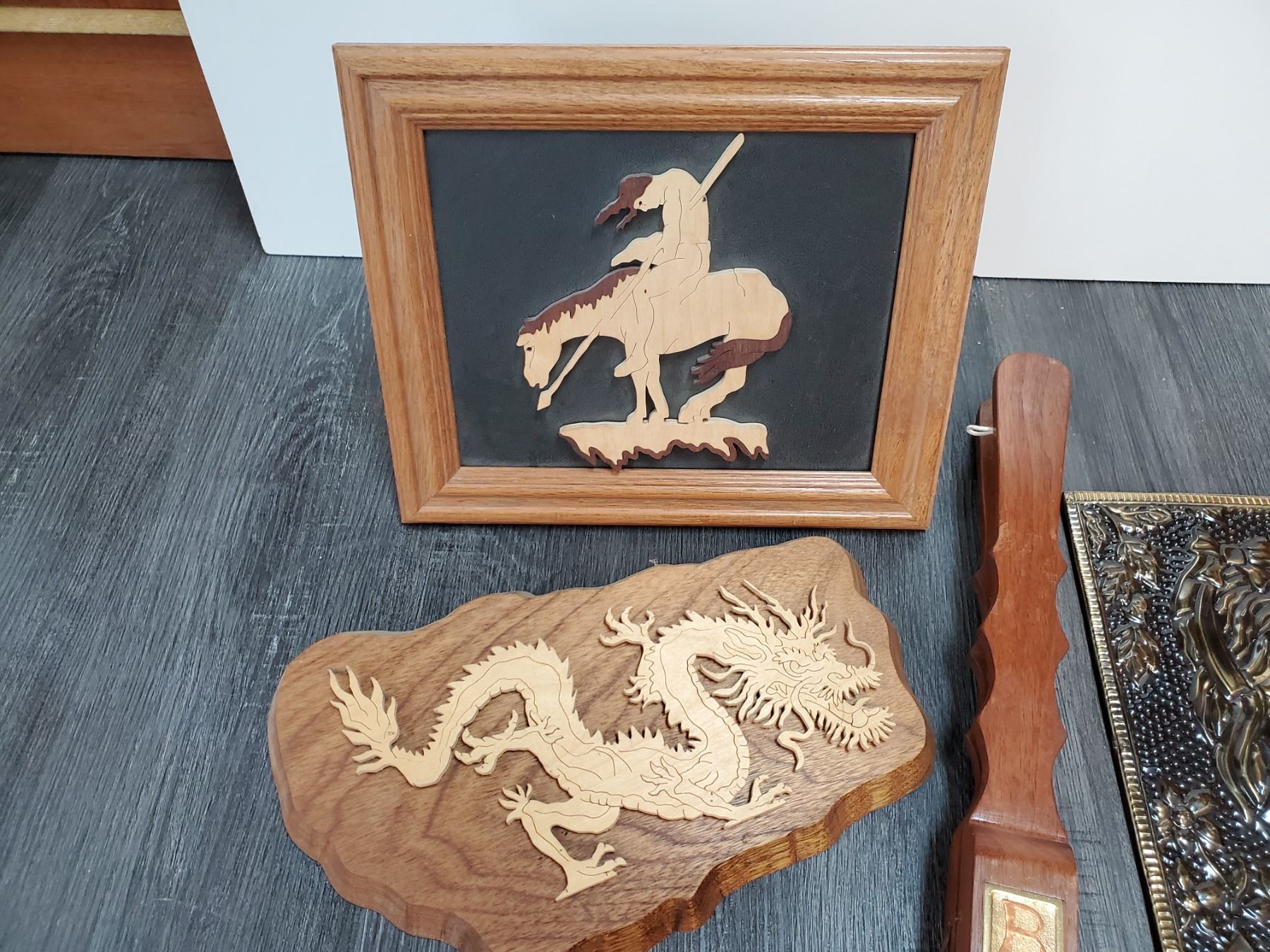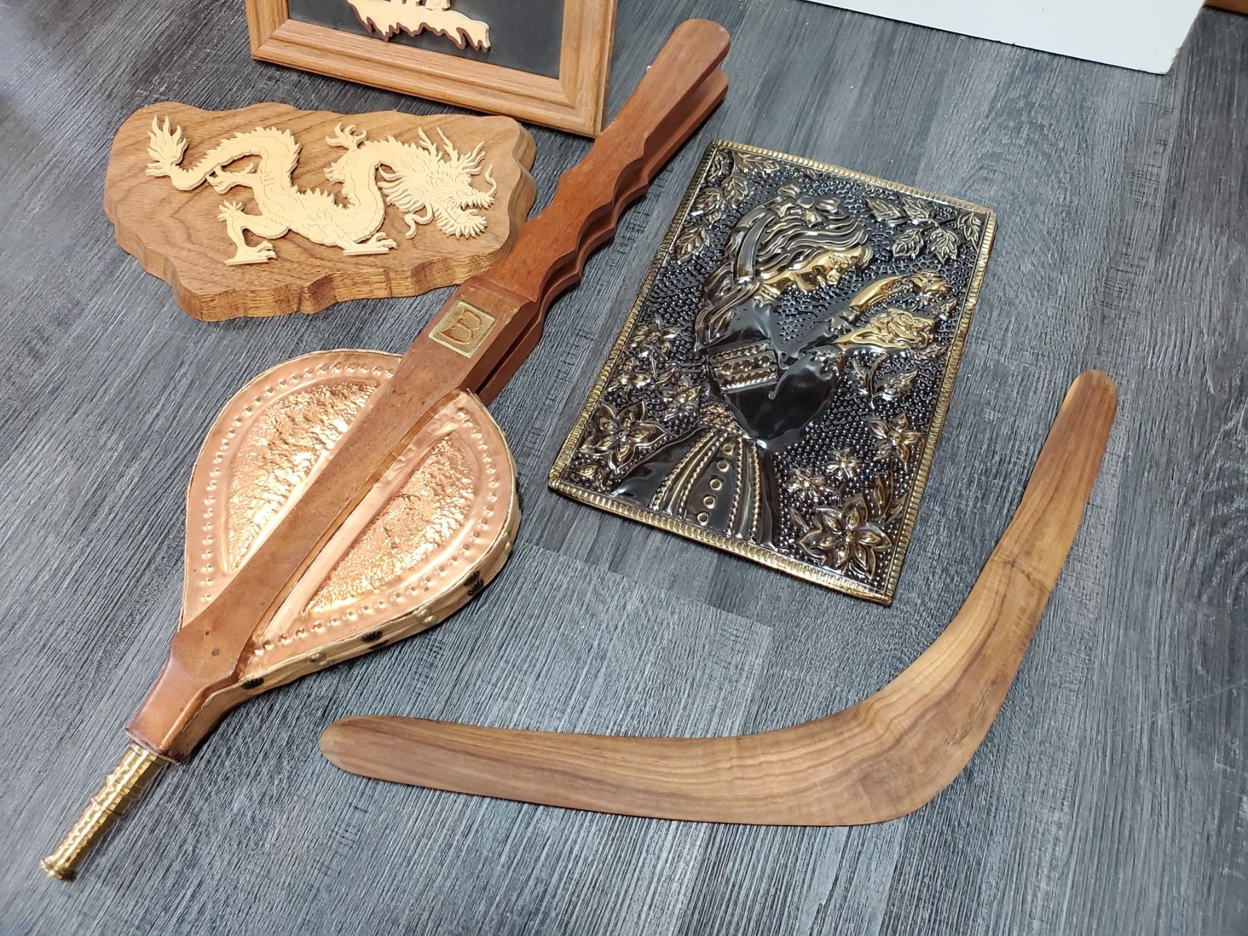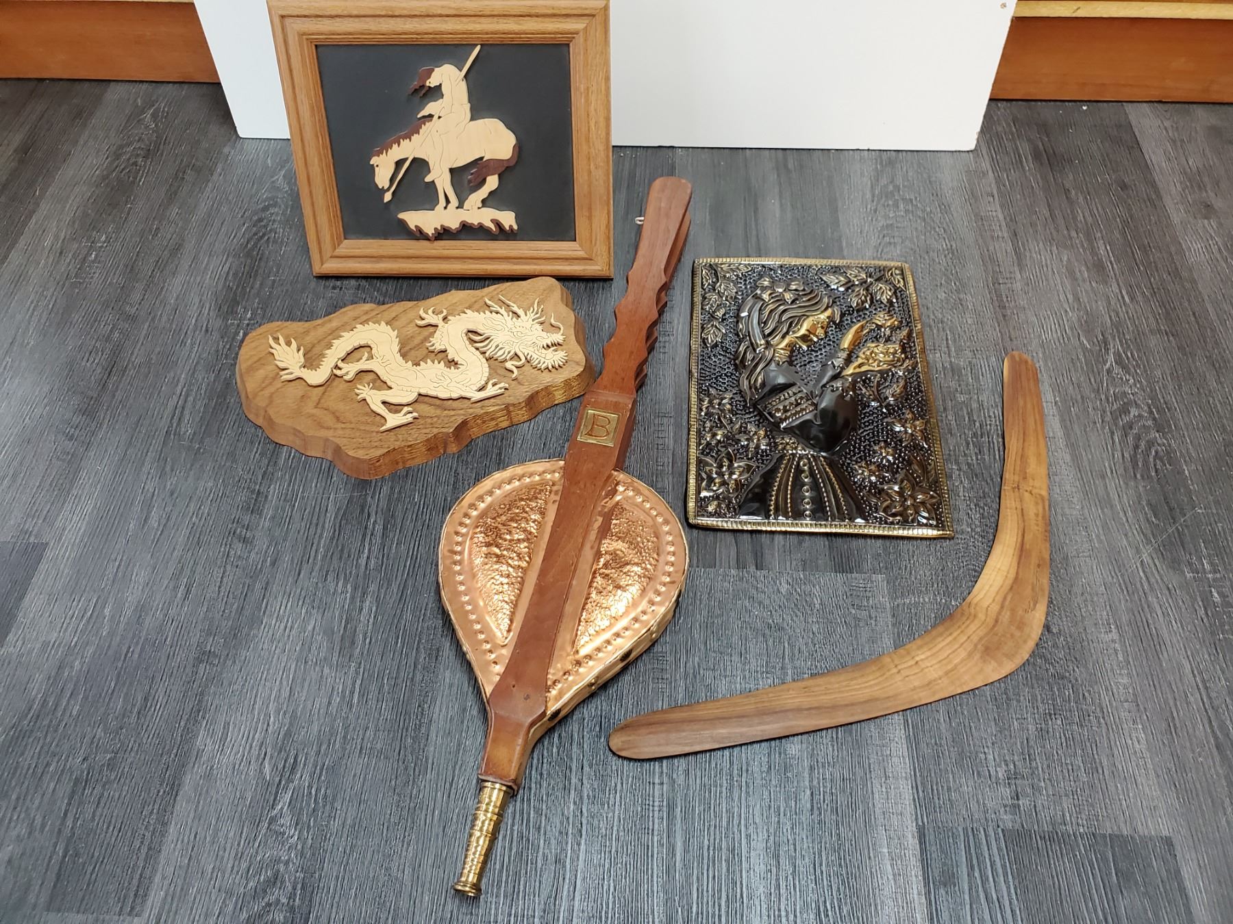 Boomerang, Bellows, & Carved wall hangings - 17% Buyer Fee. Payment Processed through Live Auction World ( Visa or Master Card ) pick up Saturday, or Tuesday