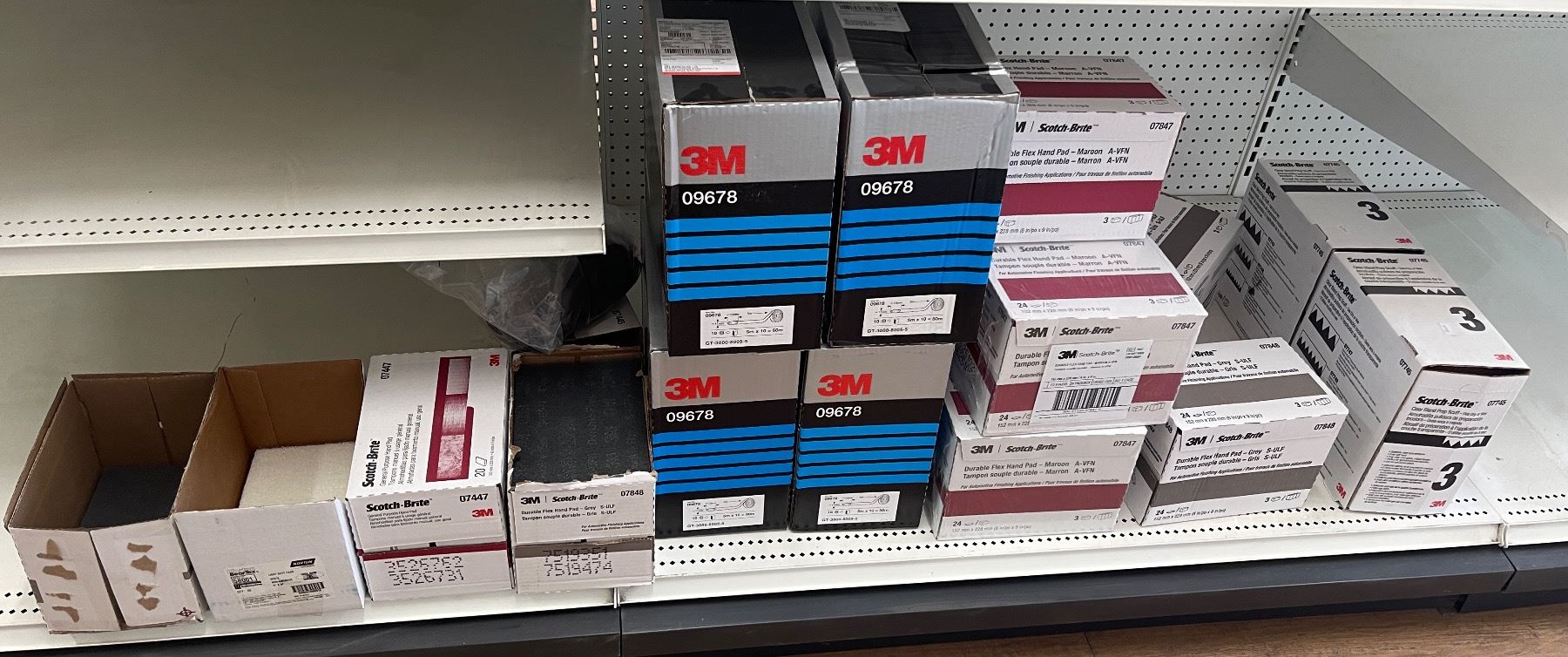 Bottom Shelf of Misc Including - Soft Edge Masking Foam Tape, Flex Hand Pad, Clear Blend Prep Scuff, Hand Pads, Etc.