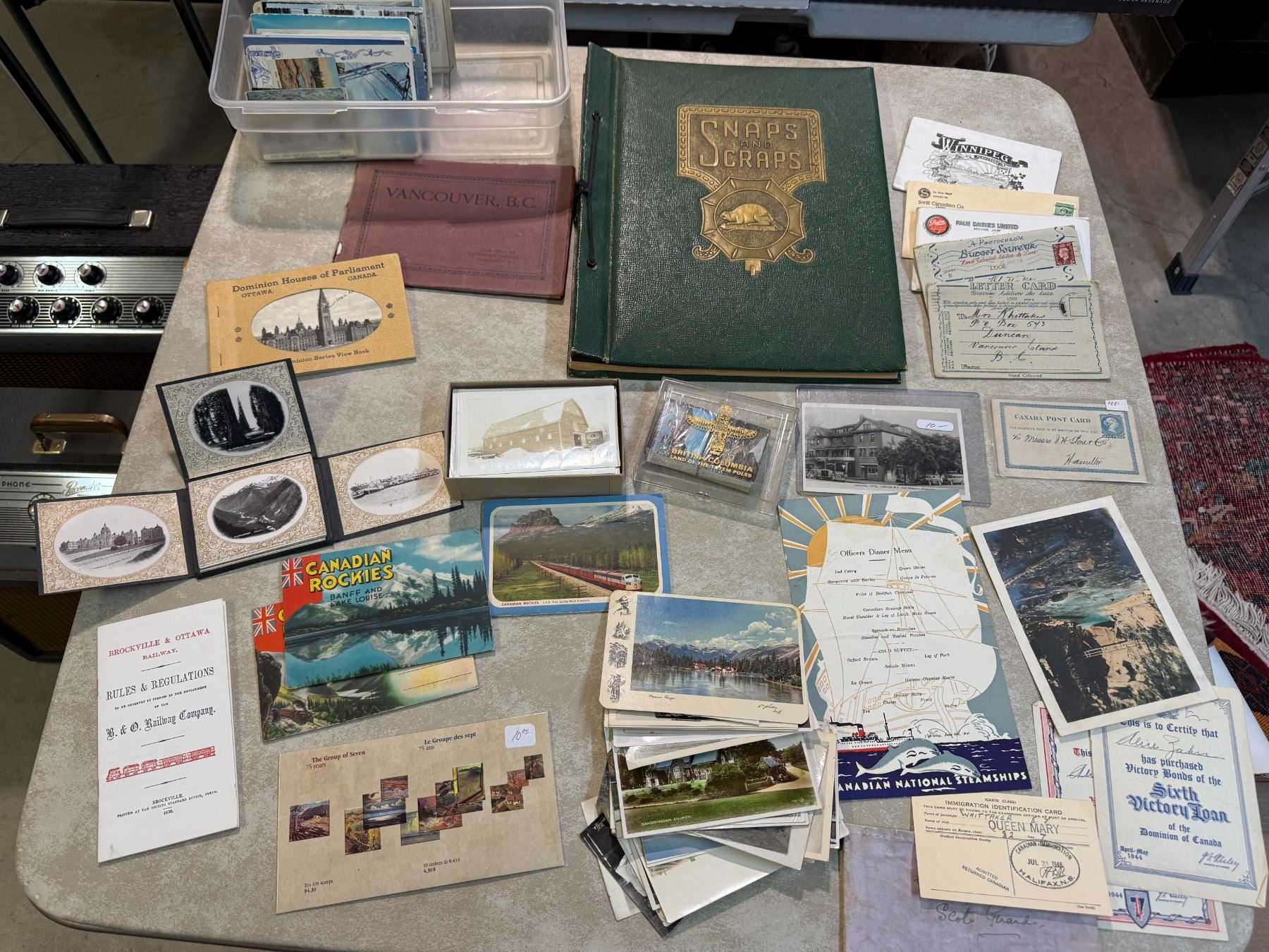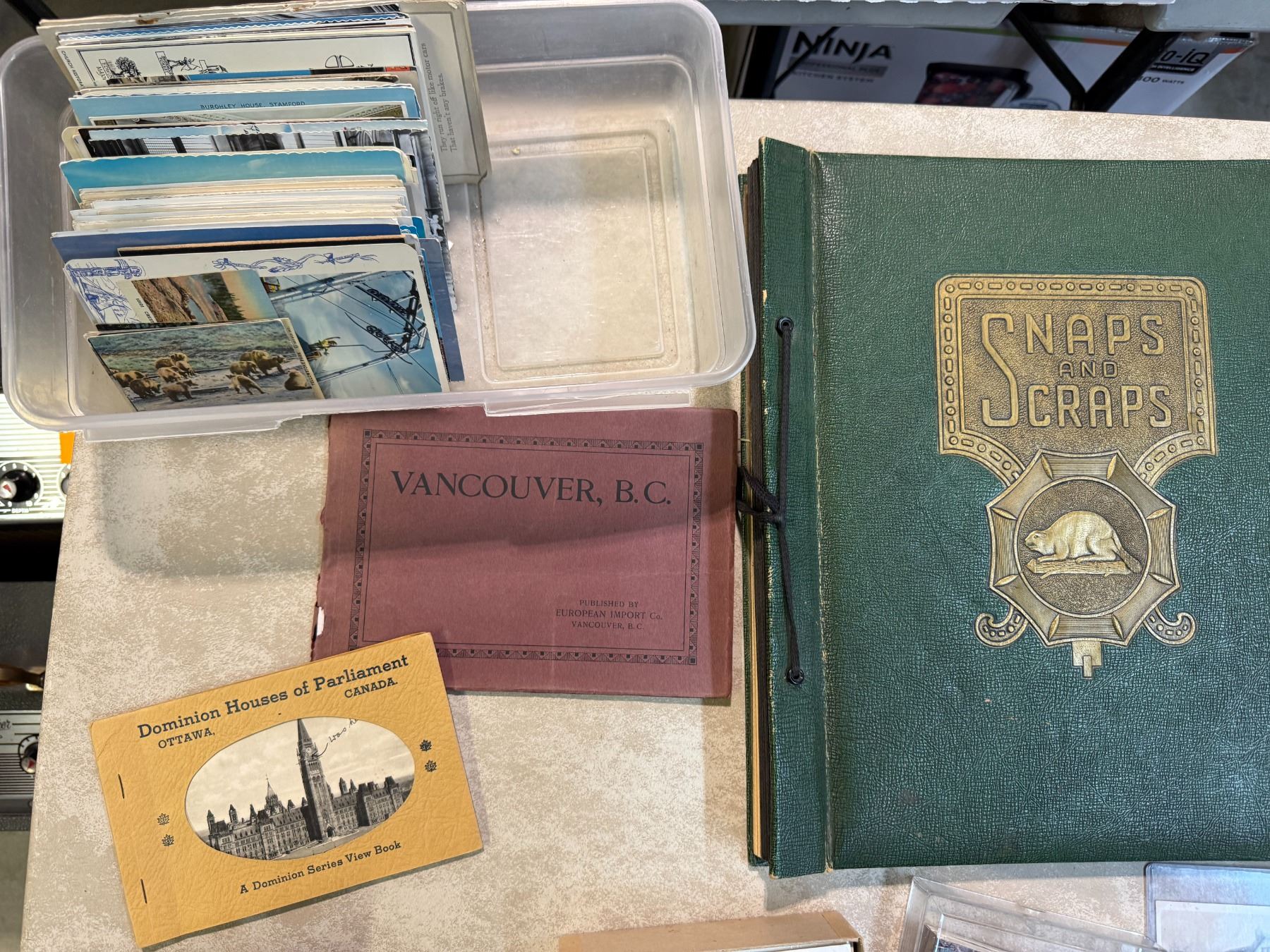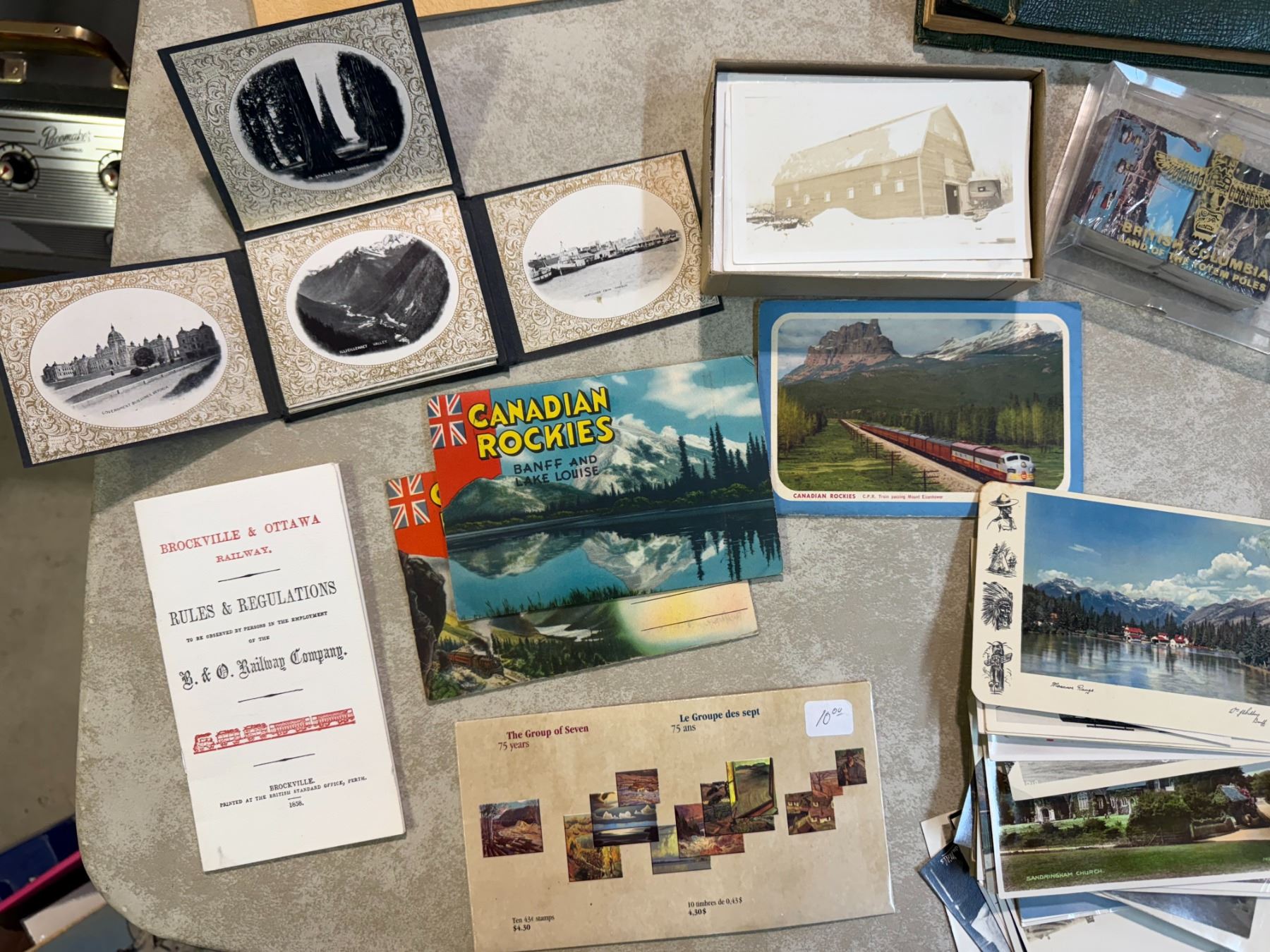 Box: Assorted Canadiana Postcards, Postcard Album, and Ephemera