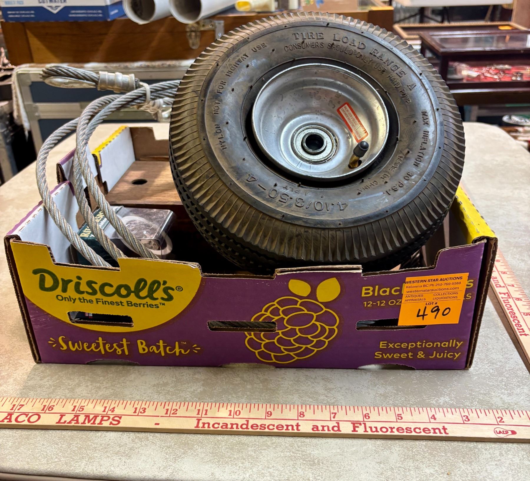 Box: Dolly Tires, Compasses, Grab Hooks, Cable, and Misc Chains, Latches, Adapters, etc.