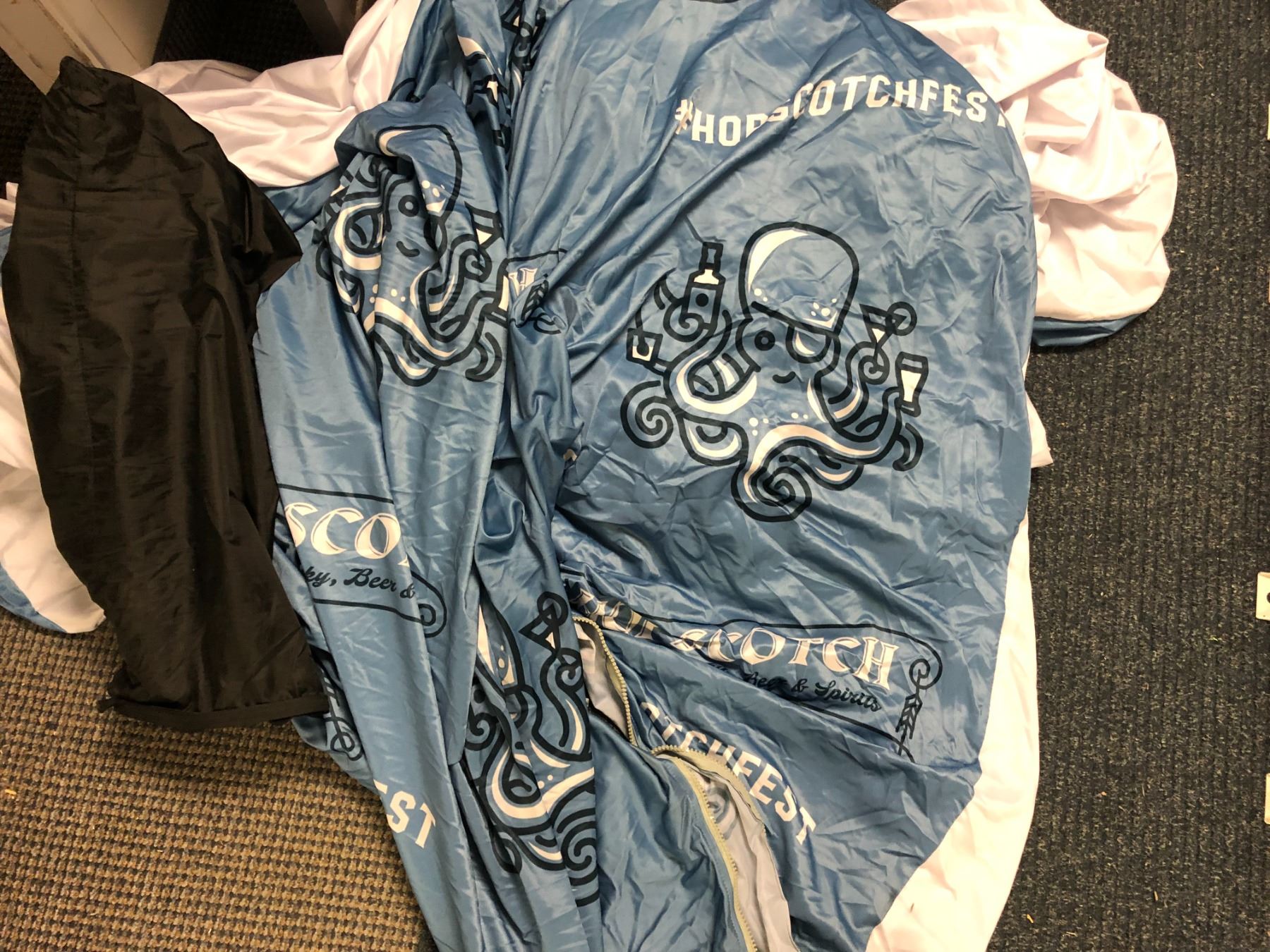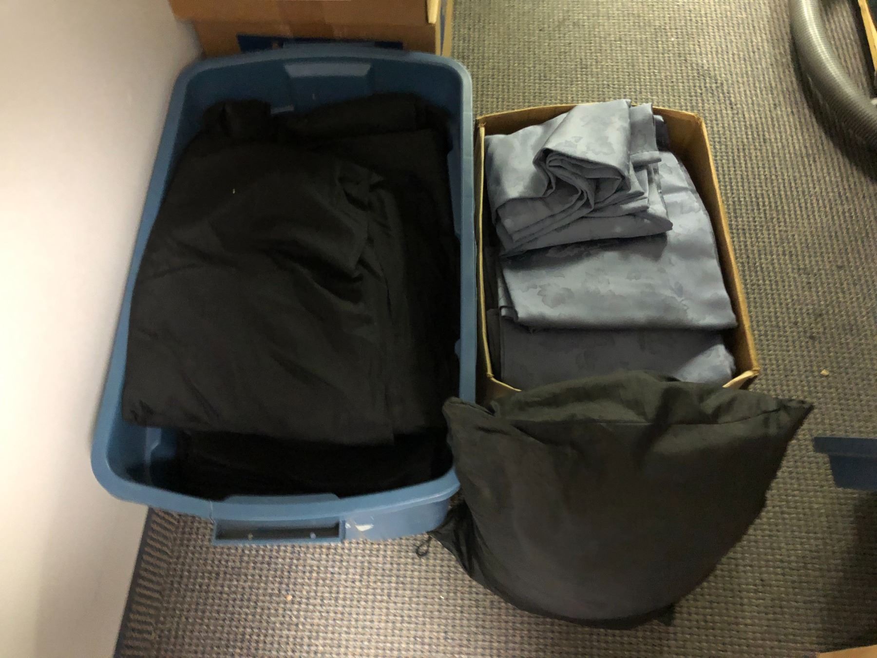 Box Filled w/ Hospital Drapes/ Tote Filled w/Black Table cloths & 2 Bags of Event Display Advertisme