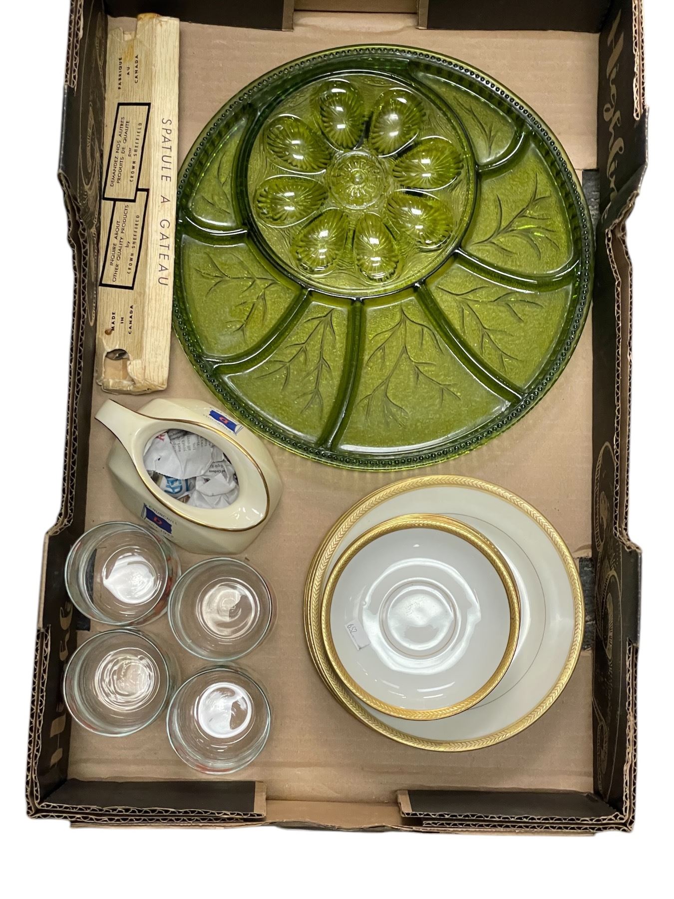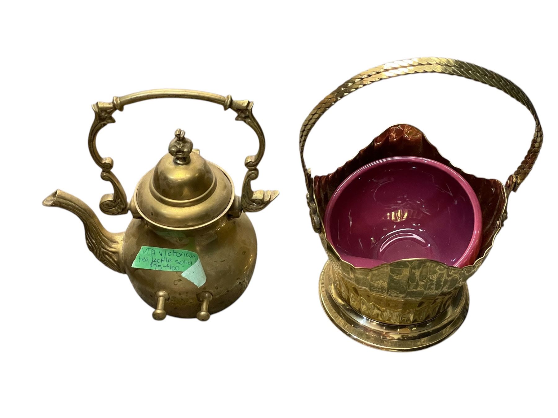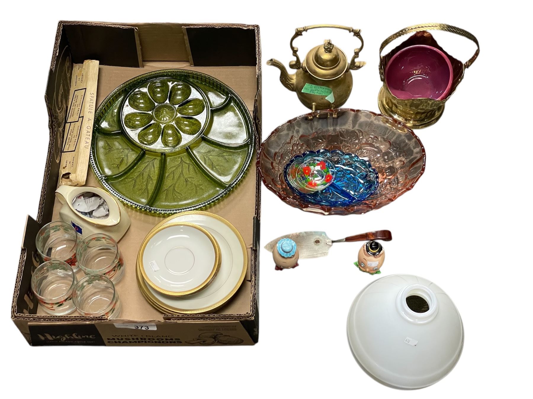 Box Full Of Assorted Collectibles, Brass Teapot, Salt And Peppers, Shades, Bowls & Platters